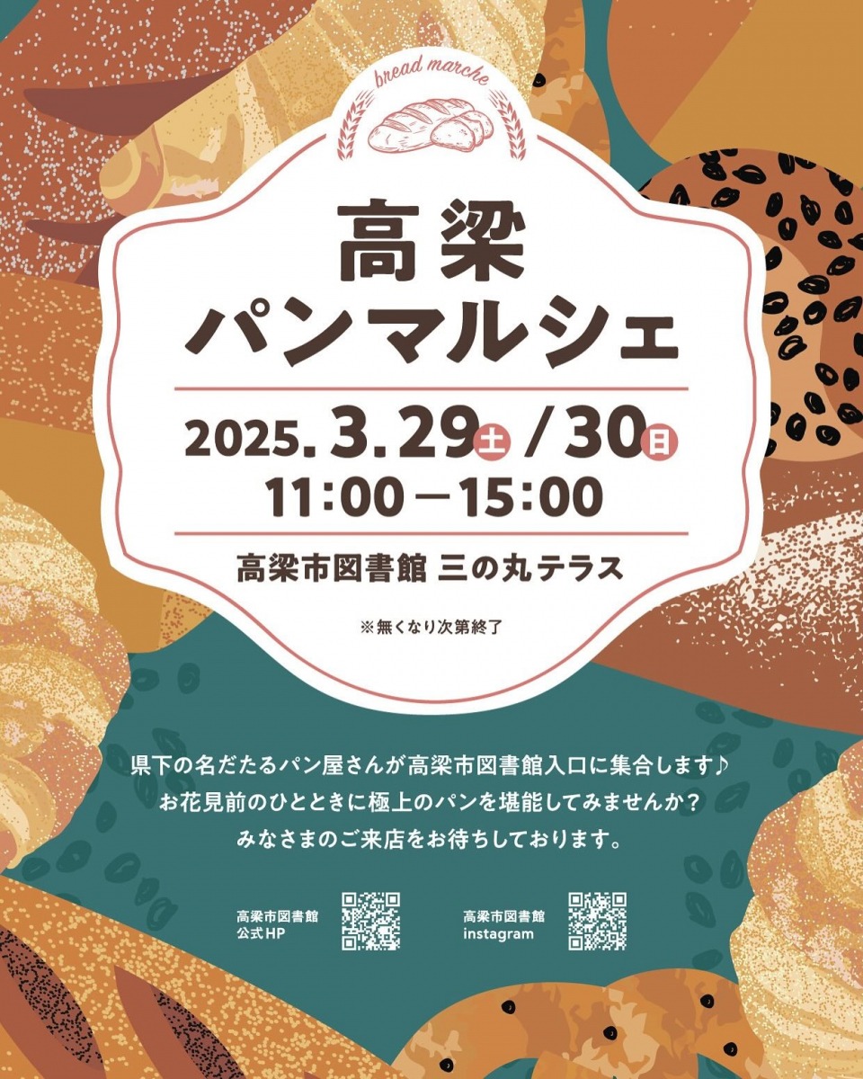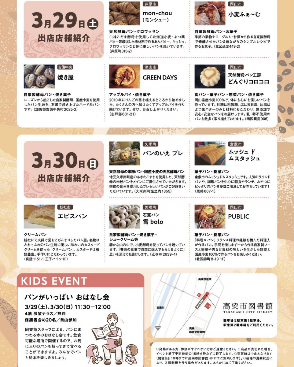 高梁市図書館にて「高梁パンマルシェ」が開催されます。県下の名だたる魅力的なパン屋さんが集合。売り切れ次第終了となります。