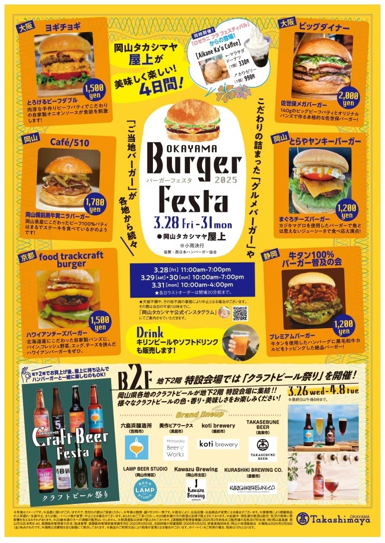 岡山タカシマヤ屋上にてが「バーガーフェスタ」が開催されます。こだわりの詰まった「グルメバーガー」や「ご当地バーガー」が各地から集まります。