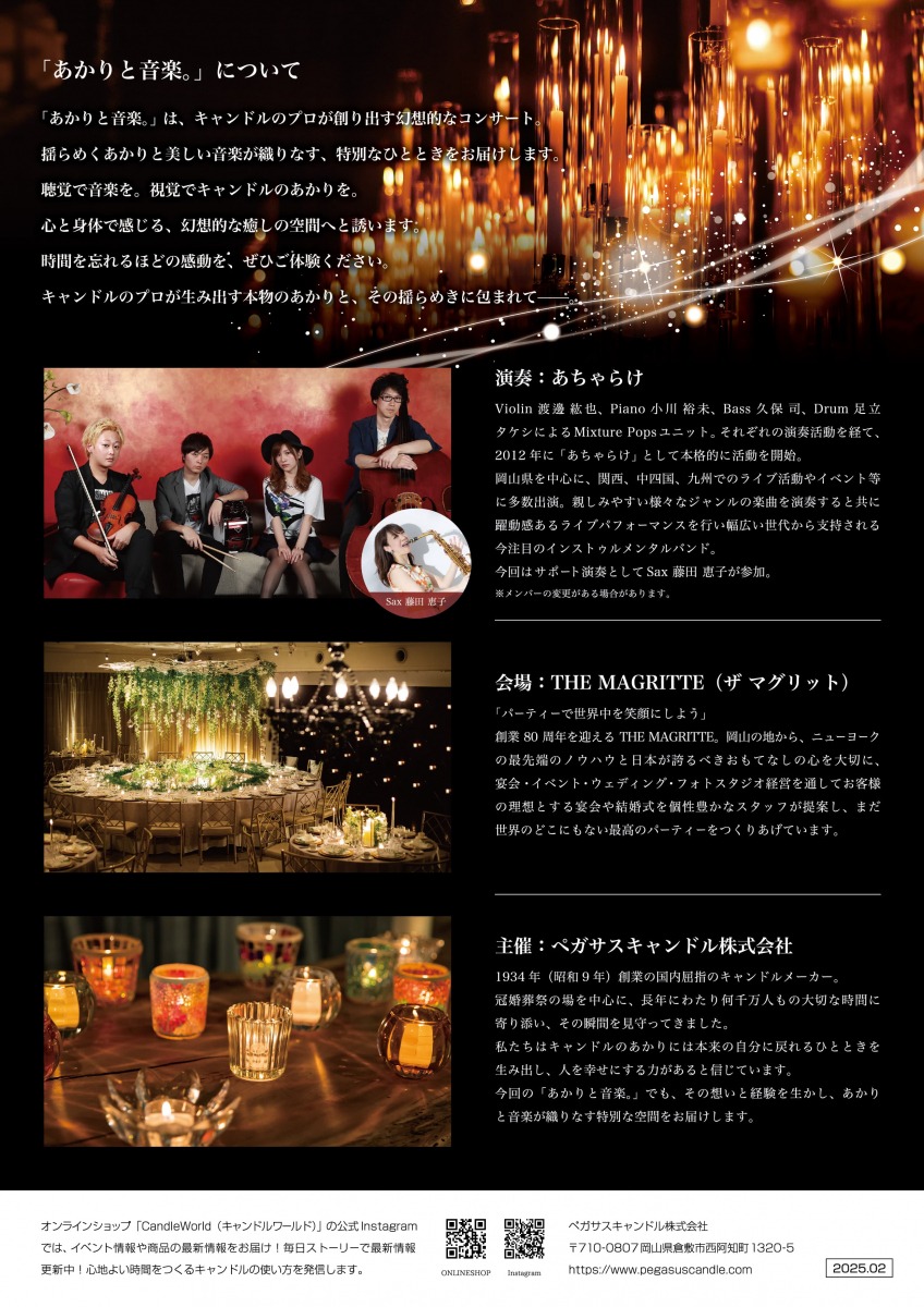 イベントの問い合わせは、ペガサスキャンドル株式会社(E-mail:info@candleworld.co.jp)までご連絡ください。