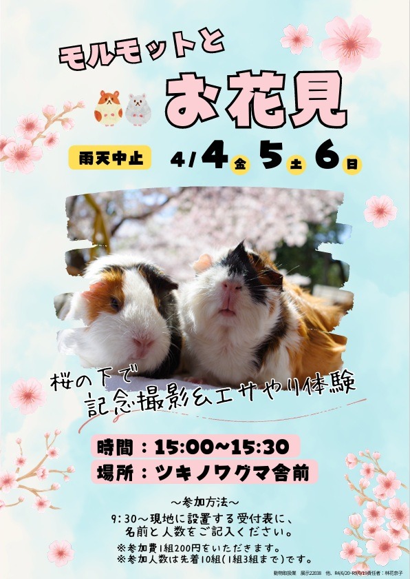岡山市内中心部からも近い京山にある全国でもめずらしい山を利用した「池田動物園」にて、モルモットとお花見ができるイベントが開催されます。園内に桜が咲き誇るこの時期限定のイベントです。団子に見立てたエサをあげることもできます。