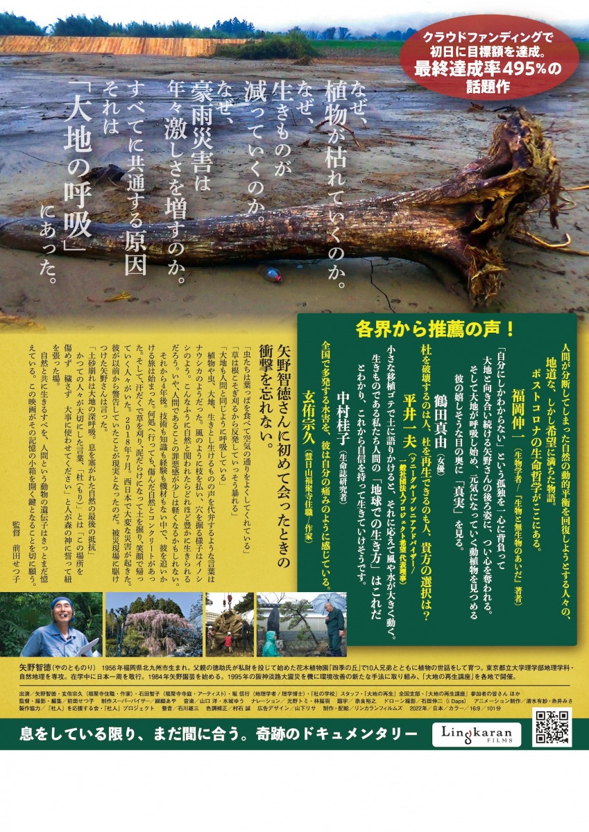 当日は岡山市から〝大地の再生〟を実践している杉本圭子さんをゲストに、上映後に貴重なお話しを聞けます。(映画にも登場されています。)