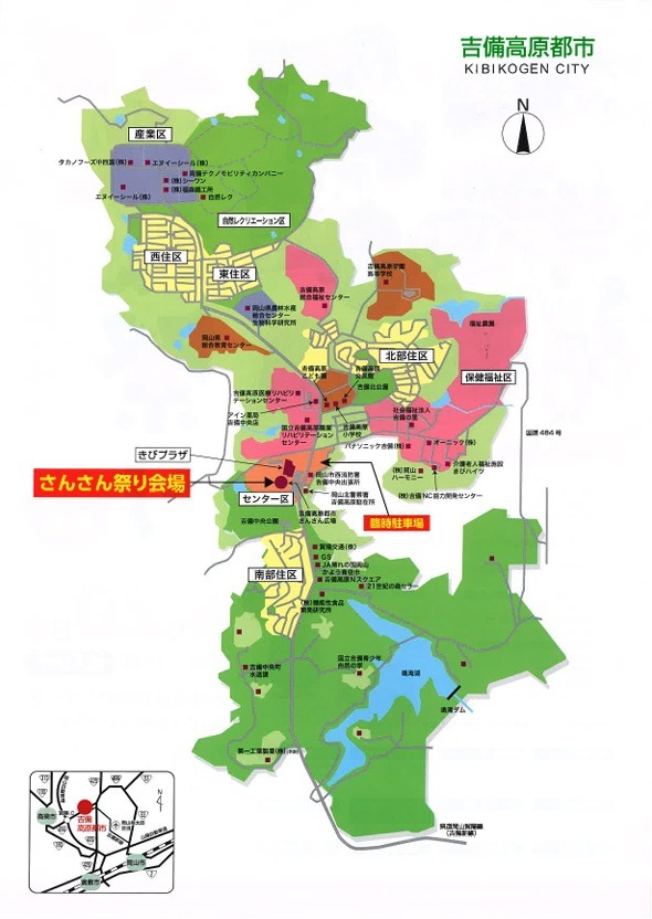 吉備高原都市センター区のきびプラザに隣接している円形広場を中心に「さんさん祭り」が開催されます。音楽コンサートや郷土芸能のステージイベント、毎年恒例の食の市やフリーマーケット、展示・体験コーナーなどが繰り広げられます。