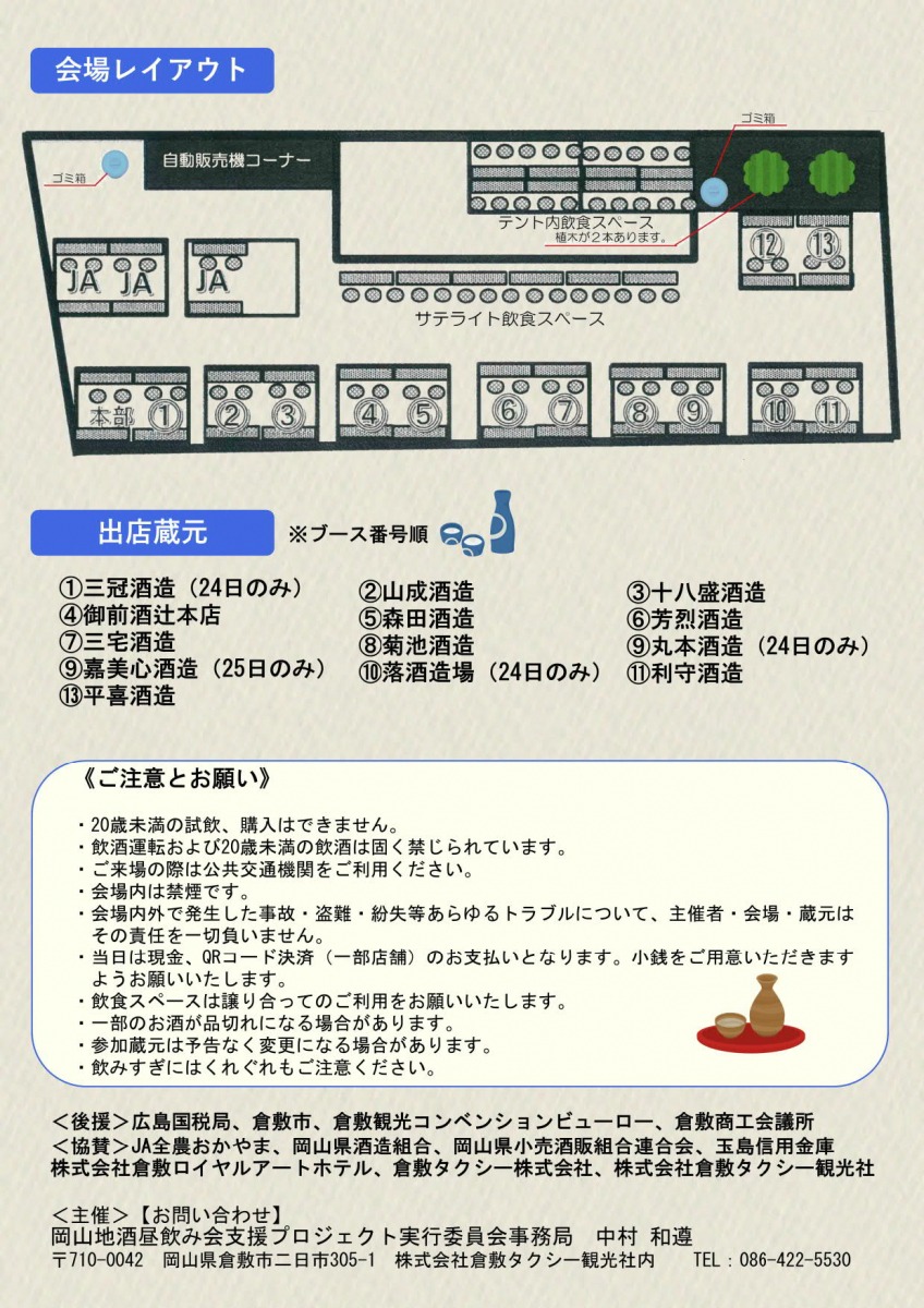 - 086-422-5530(岡山地酒昼飲み会支援プロジェクト実行委員会(株式会社倉敷タクシー観光社内))