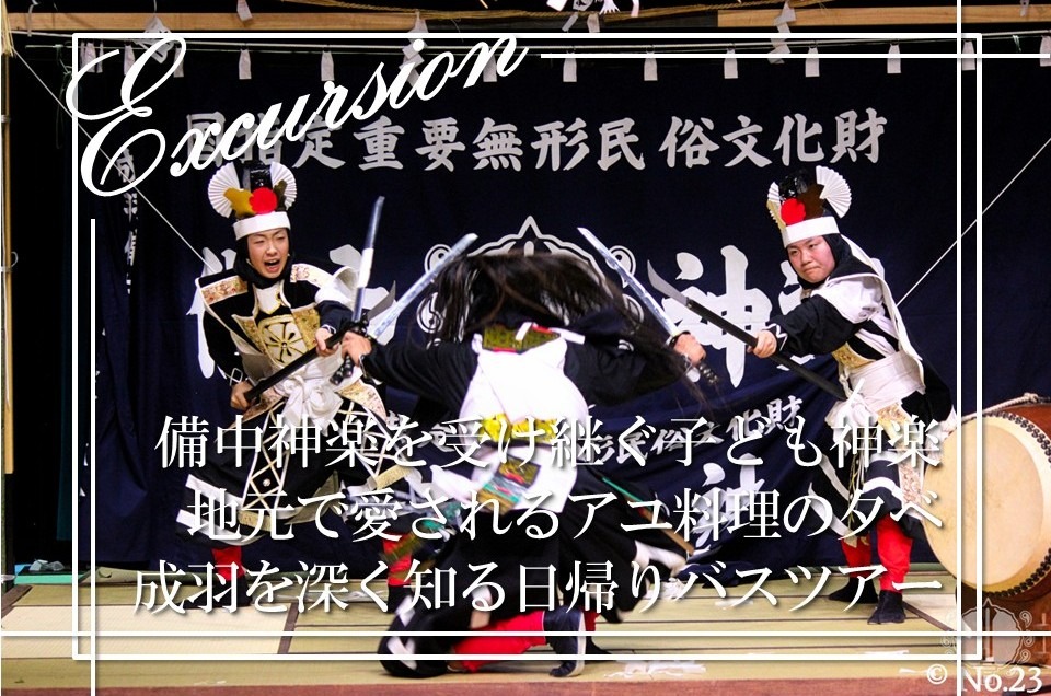 【おかやま満喫旅】備中神楽発祥の地で伝統を受け継ぐ子ども神楽と地元で愛される納涼花火アユ料理の夕べ 成羽を深く知る日帰りバスツアー