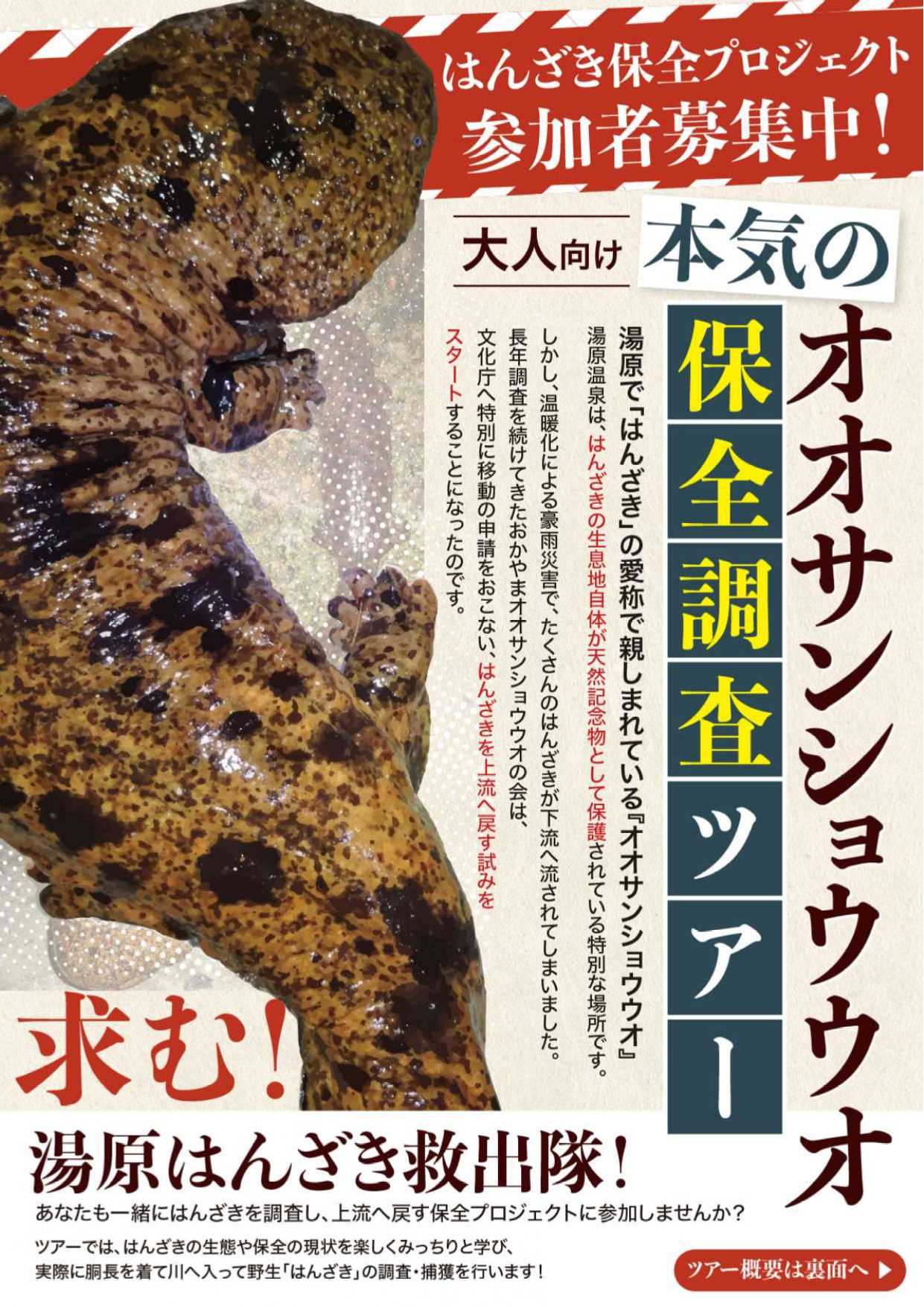 ツアーでは、はんざきについて学ぶだけでなく、生態調査、生息地の保全に関わる事ができる唯一の参加型ツアーです。ここならではのプログラムで普段は見ることが難しい、自然の中で生きる“はんざき”の姿を間近で感じることができます。