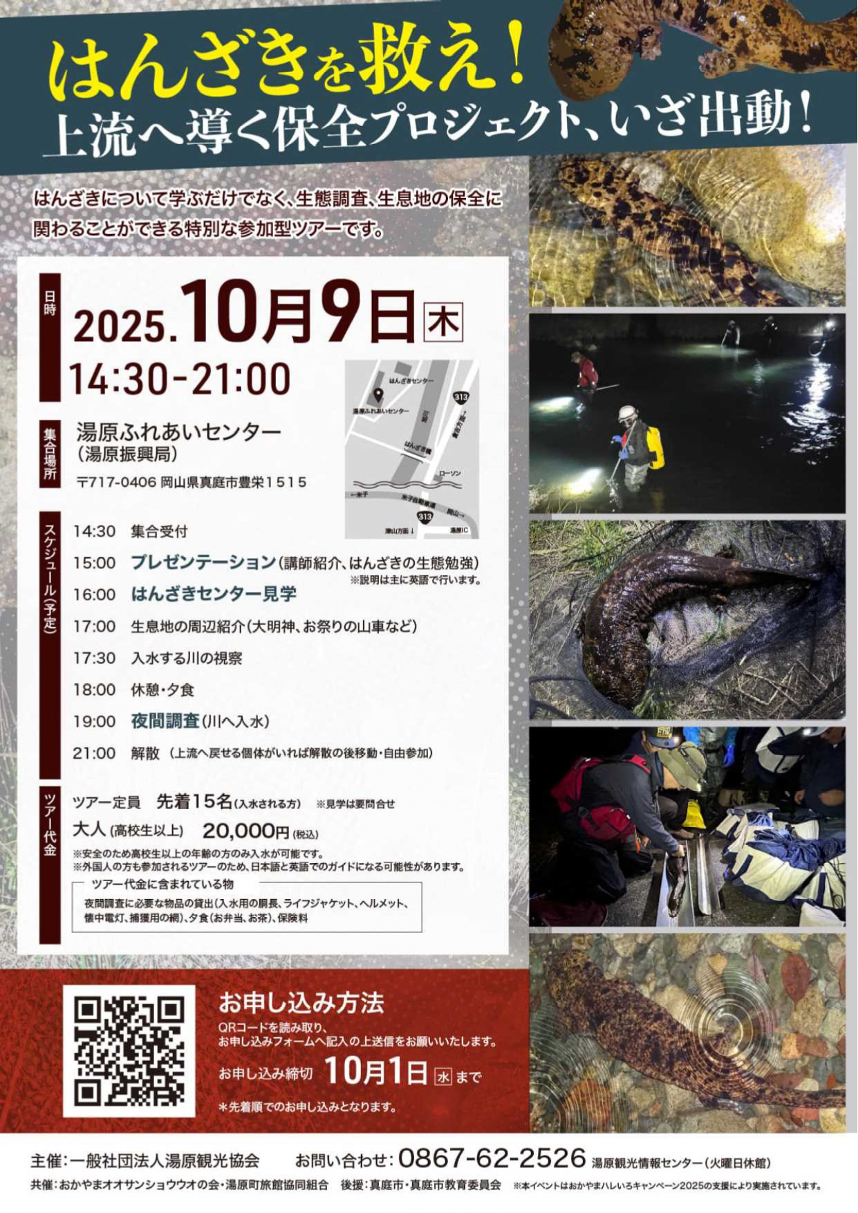 湯原で「はんざき」愛称で親しまれている国の特別天然記念物「オオサンショウウオ」ですが、湯原温泉は、はんざきの生息地自体が天然記念物として保護されている特別な場所です。そんな湯原温泉で「オオサンショウウオ保全調査ツアー」が追加開催されます。プレゼンテーションは主に英語説明になります。(日本語翻訳あり)