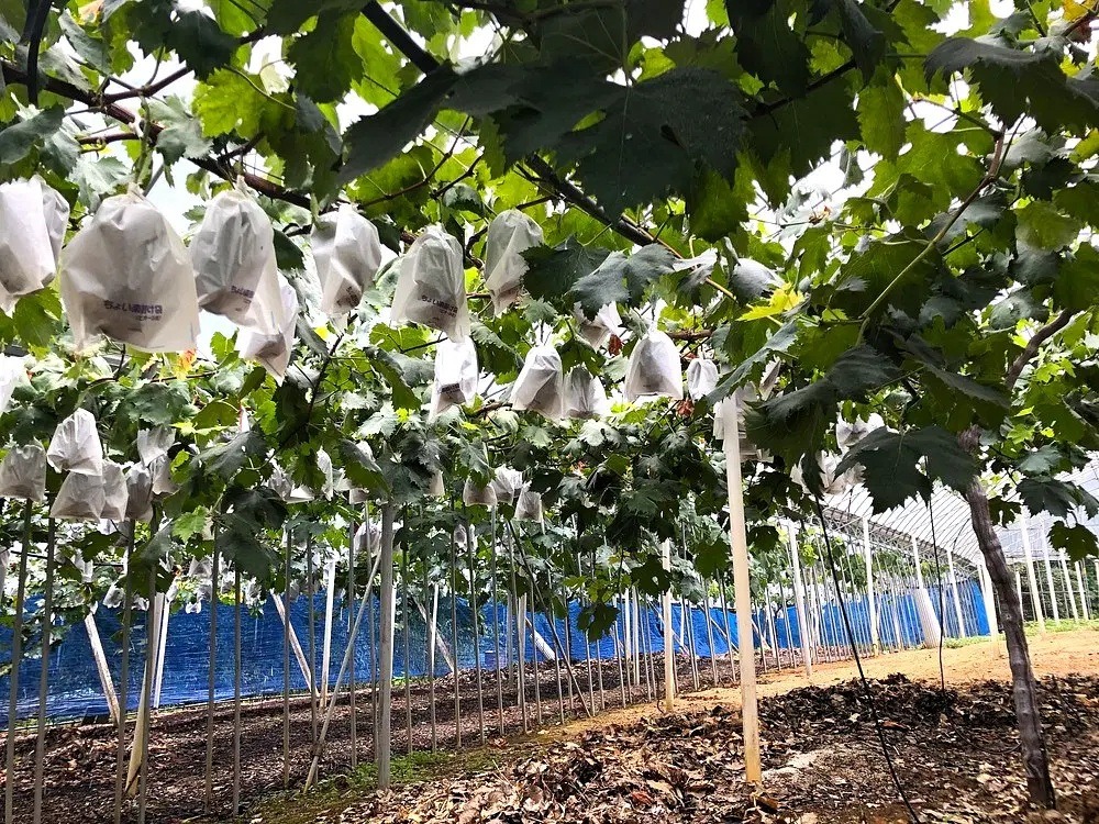・ぶどうの育成状況により白紙で保護している場合は、白紙の上からぶどうを選んで収穫となります。