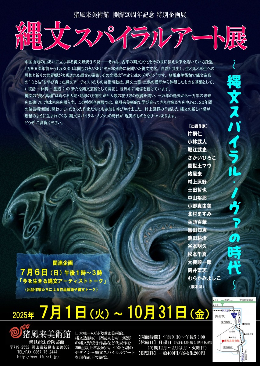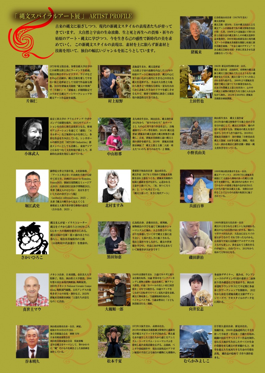 縄文の“美と真理”は母なる大地・地球の万物生命と人類の在り方の根源を問い、一万年の過去から一万年の未来を見通して、地球未来を照らす。そうした活動のトップランナー猪風来美術館の20周年記念特別企画展では、猪風来美術館で学び育ってきた作家たちを中心に、この20年間の諸芸術活動に関わってくださった作家たちにも参加を呼びかけました。古来の縄文に根ざしつつ、現代の新縄文スタイルの表現者たちが育ってきています。この新縄文スタイルの表現は、素材を土に限らず新素材と技術を用いて、立体と平面、テキスタイル、音楽と映像など総合芸術として発展しつつ 独自の幅広いジャンルを拓こうとしています。村上原野の予感した、縄文の新しい渦が新星のように生まれてくる「縄文スパイラル・ノヴァ」の時代が現実のものとなりつつあります。