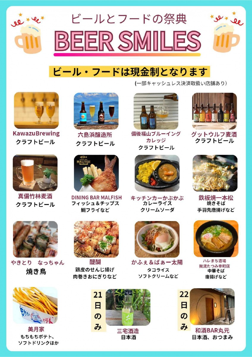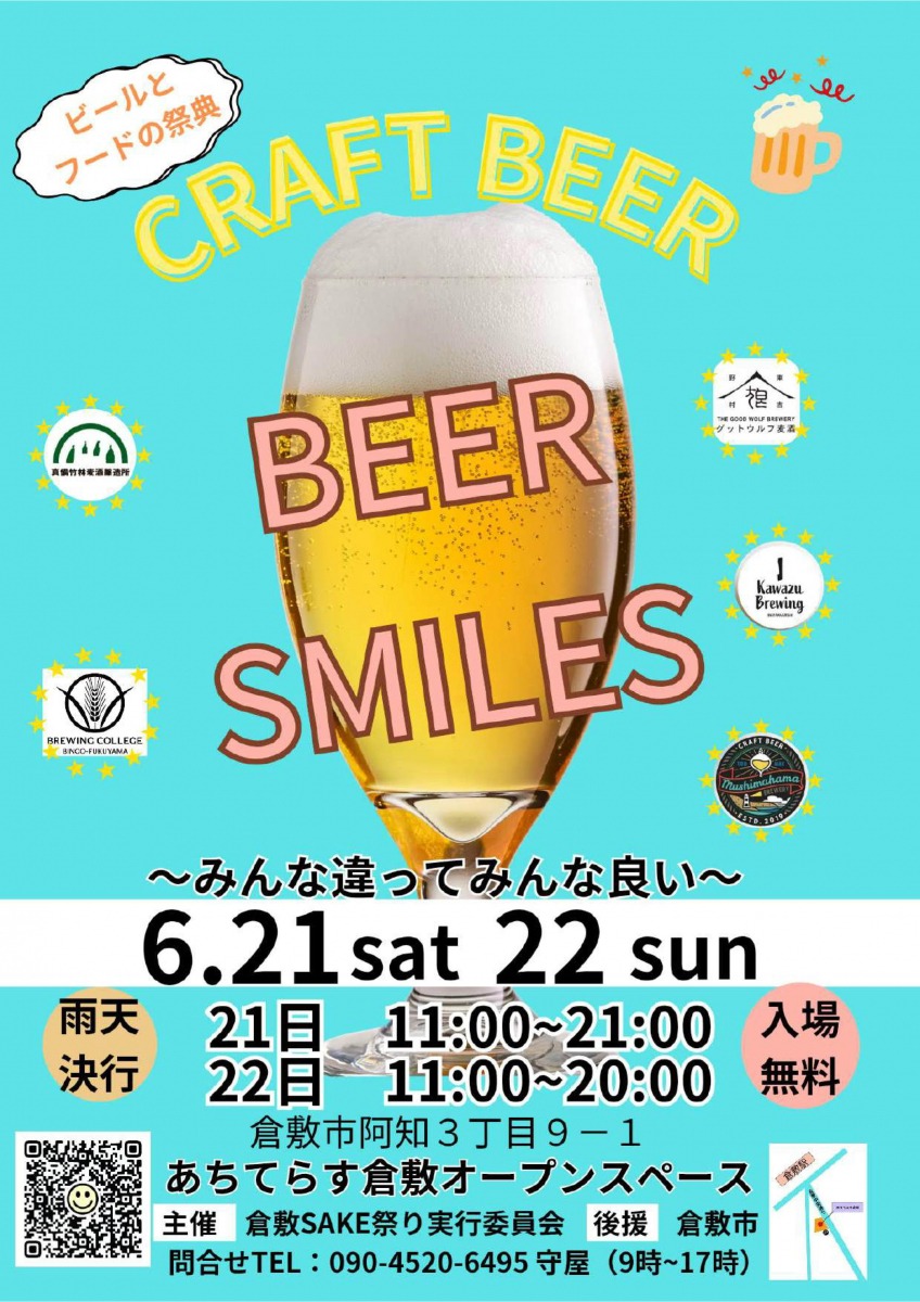 あちてらす倉敷オープンスペースにて「BEER SMILES ~みんな違ってみんな良い~」が開催されます。クラフトビールの飲み比べや地元の食材を活かしたフードを堪能できます。