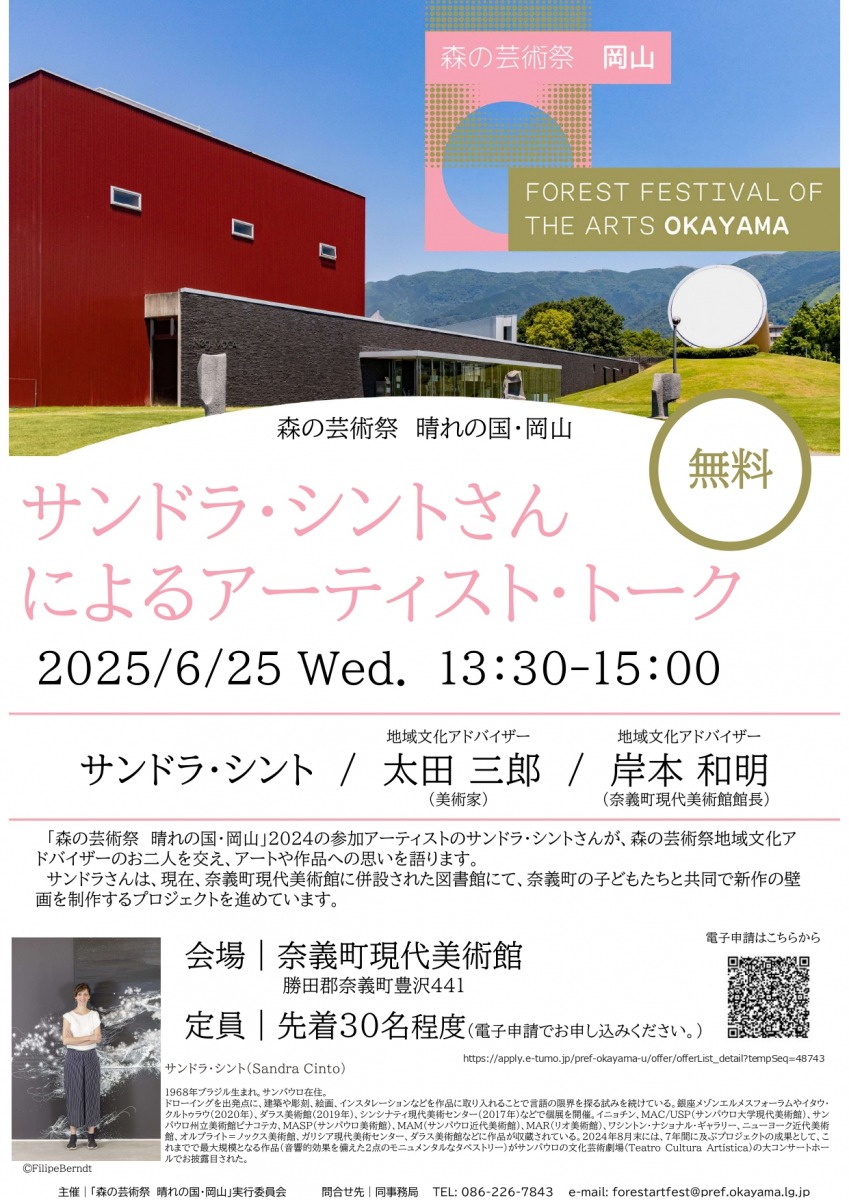 奈義町現代美術館にて「森の芸術祭 晴れの国・岡山」2024の参加アーティストであり、現在、奈義町立図書館にて新作の壁画を制作しているサンドラ・シント氏のトークイベントが開催されます。