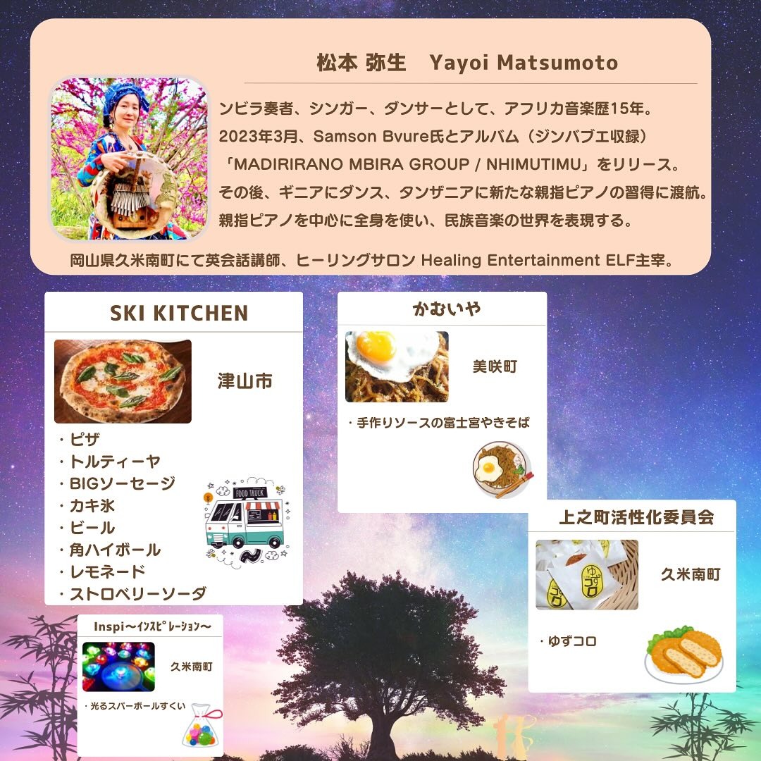 平日の夜に久米南町にて、素敵な演奏と美味しい食べ物が楽しめるイベントが開催されます。土日のイベントには中々参加出来ない方も気軽に立ち寄れるイベントです。七夕イベントとして短冊コーナーが設置され、川柳短冊にもチャレンジできます。夜の道の駅の公園は、晴れていたら月灯りや星空も綺麗です。