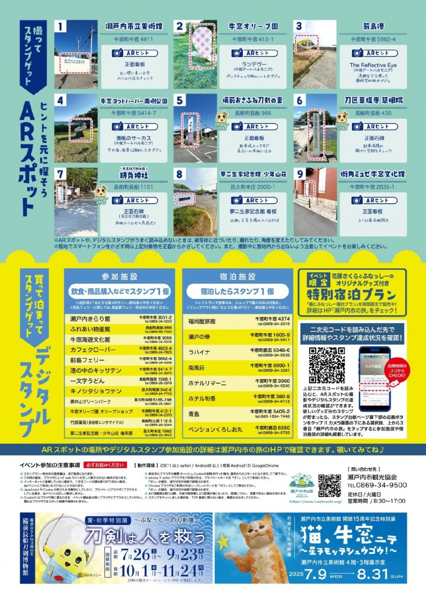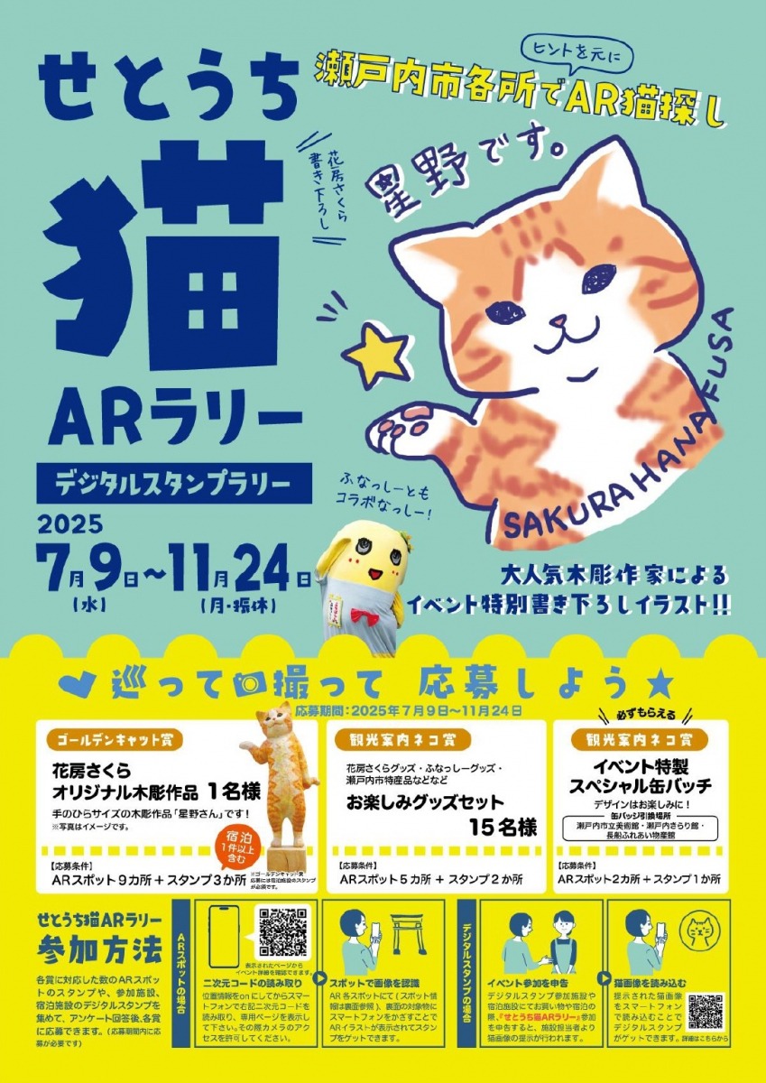 瀬戸内市内の観光名所やお店をめぐる、AR(拡張現実)を活用したデジタルスタンプラリー「せとうち猫ARラリー」が開催されます。イベントでは、木彫作家 花房さくら特別書き下ろしイラストや船橋市非公認ご当地キャラクターふなっしーが登場します。