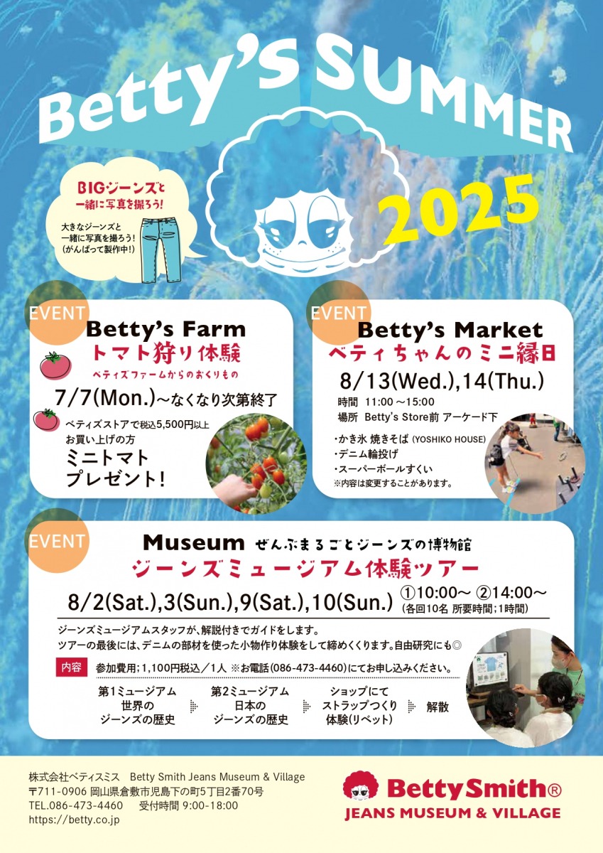 ベティスミスジーンズミュージアム&ヴィレッジにて、「トマト狩り体験」や「ベティちゃんのミニ縁日」など、様々な夏のイベントが開催されます。