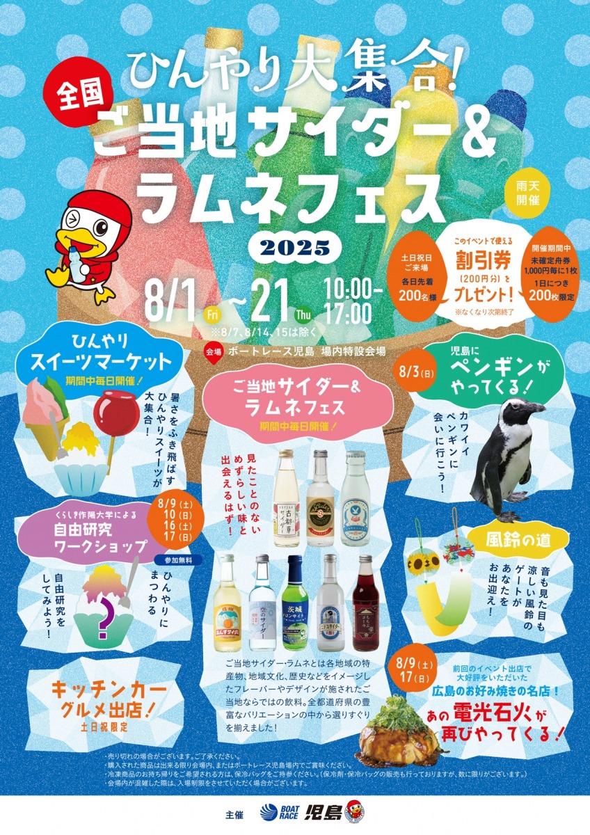 ボートレース児島にて、全国47都道府県のご当地サイダーやラムネが大集合するイベントが開催されます。各地域の特産物、地域文化、歴史などをイメージしたフレーバーやデザインが施されたご当地ならではのこだわりを感じる逸品が勢ぞろい。そのほか、暑さを吹き飛ばす、ひんやりスイーツも集合。