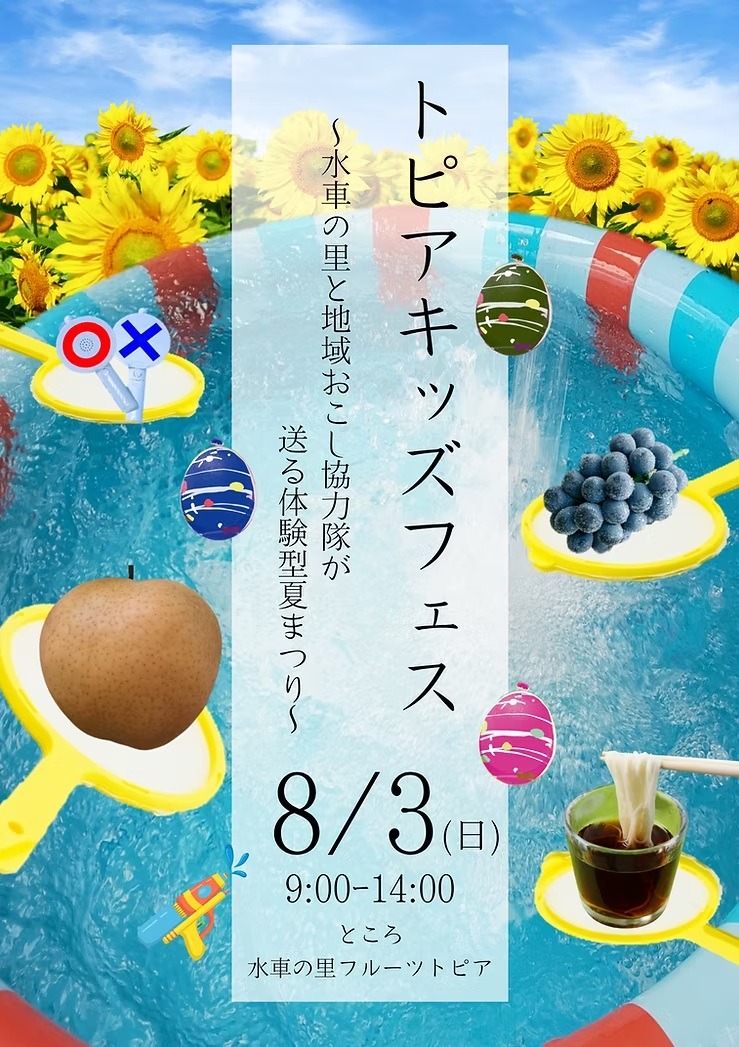 水車の里フルーツトピアにて、遊びと学びの体験が満載のイベント「トピアキッズフェス」が開催されます。