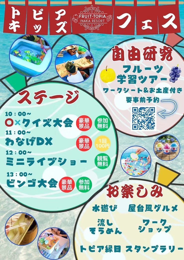 素敵なプレゼントがもらえるゲームイベントや小学生対象の宿題応援自由研究、ワークショップやクイズ大会等盛りだくさん。その他屋台の美味しい食べ物やフルーツトピアのカフェスイーツも楽しめます。
