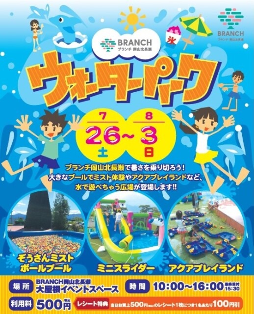 ブランチ岡山北長瀬にて、大きなプールでミスト体験(そうさんミストボールプール)やミニスライダー、アクアプレイランドなどの水で遊べる広場が登場。保護者の方が快適にお子様を見守れるように冷風機及びミスト扇風機が設置されます。