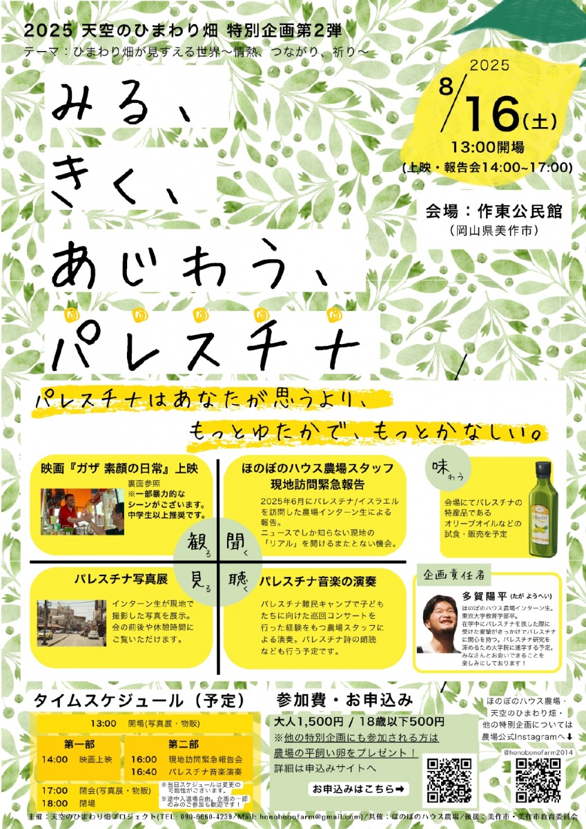 天空のひまわり畑の特別企画第2弾として、パレスチナについて五感でかんじるイベントが開催されます。(会場は作東公民館です。)映画や写真、演奏などを通してパレスチナへ思いをはせることができます。