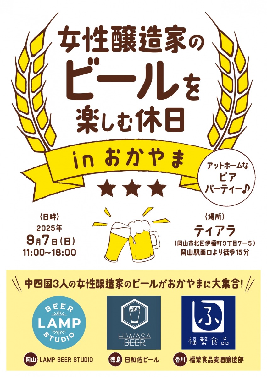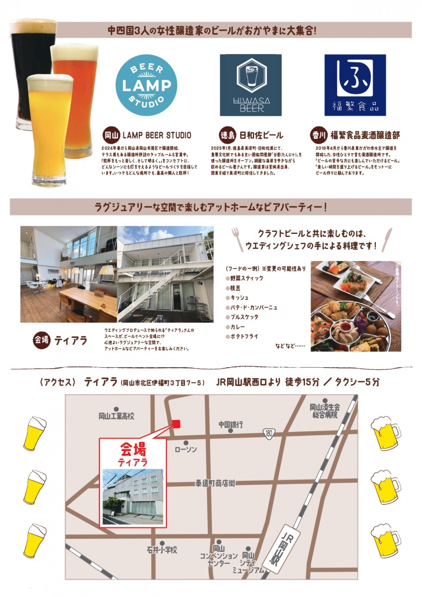中四国3人の女性醸造家のビールが集まるイベントが開催されます。ラグジュアリーな空間で楽しむアットホームなビアパーティー。クラフトビールと共にウエディングシェフの手による料理が楽しめます。