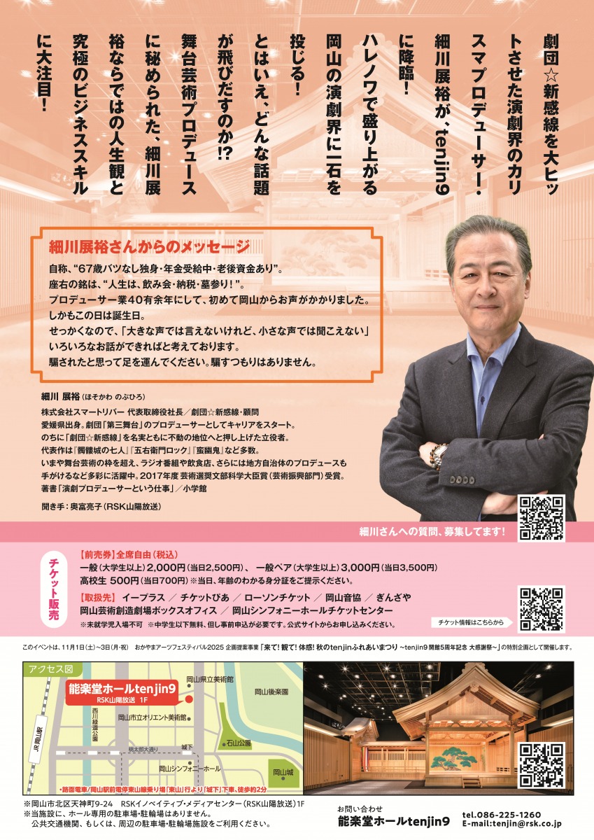 「来て!観て!体感!秋のtenjinふれあいまつり~tenjin9開館5周年記念 大感謝祭~」に、劇団☆新感線を大ヒットさせたカリスマプロデューサー・細川展裕が降臨!前人未到の70万人興行を果たした「劇団☆新感線」ヒットの理由、演劇で稼ぐ秘訣etc. 岡山芸術創造劇場ハレノワ開館で盛り上がる岡山の演劇界に一石を投じます。舞台芸術プロデュースに秘められた、細川氏ならではの人生観と究極のビジネススキルとは!?乞うご期待!!