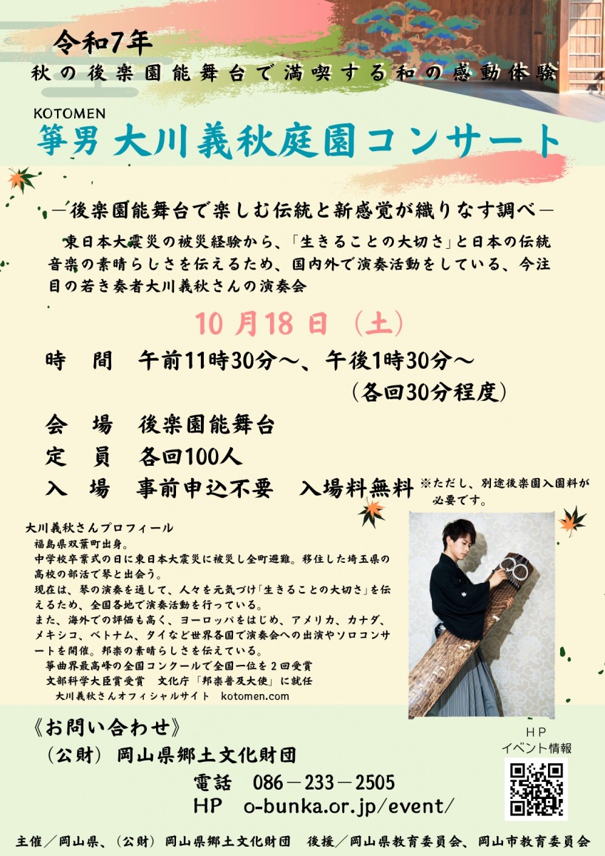 東⽇本⼤震災の被災経験から「⽣きることの⼤切さ」と⽇本の伝統⾳楽の素晴らしさを伝えるため、国内外で演奏活動をしている今注⽬の若き奏者⼤川義秋さんの演奏会が後楽園で行われます。