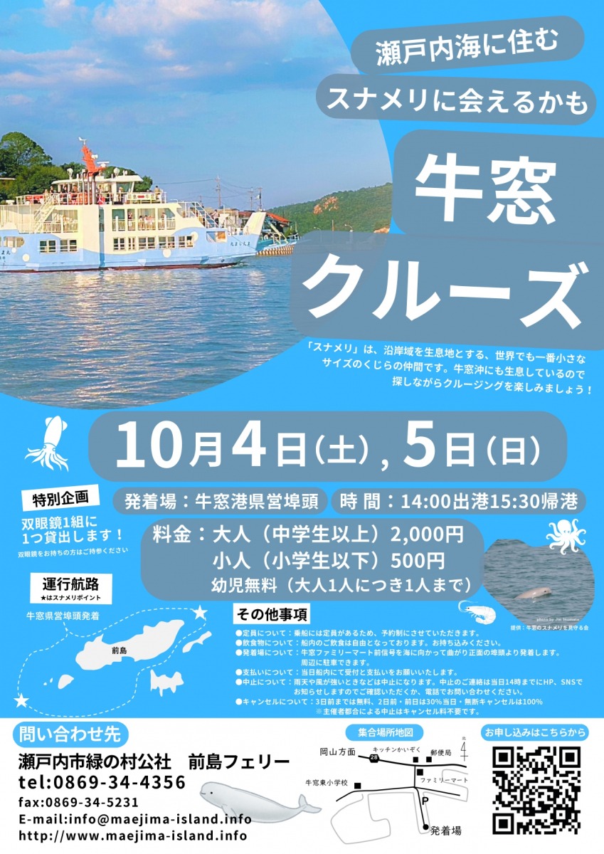 前島フェリーのイベント「牛窓クルーズ」が開催されます。「スナメリ」は、沿岸域を生息地とする世界でも一番小さなサイズのくじらの仲間です。牛窓沖にも生息しているので、探しながらのクルージングを楽しめます。スナメリ生息海域ではゆっくり走ります。