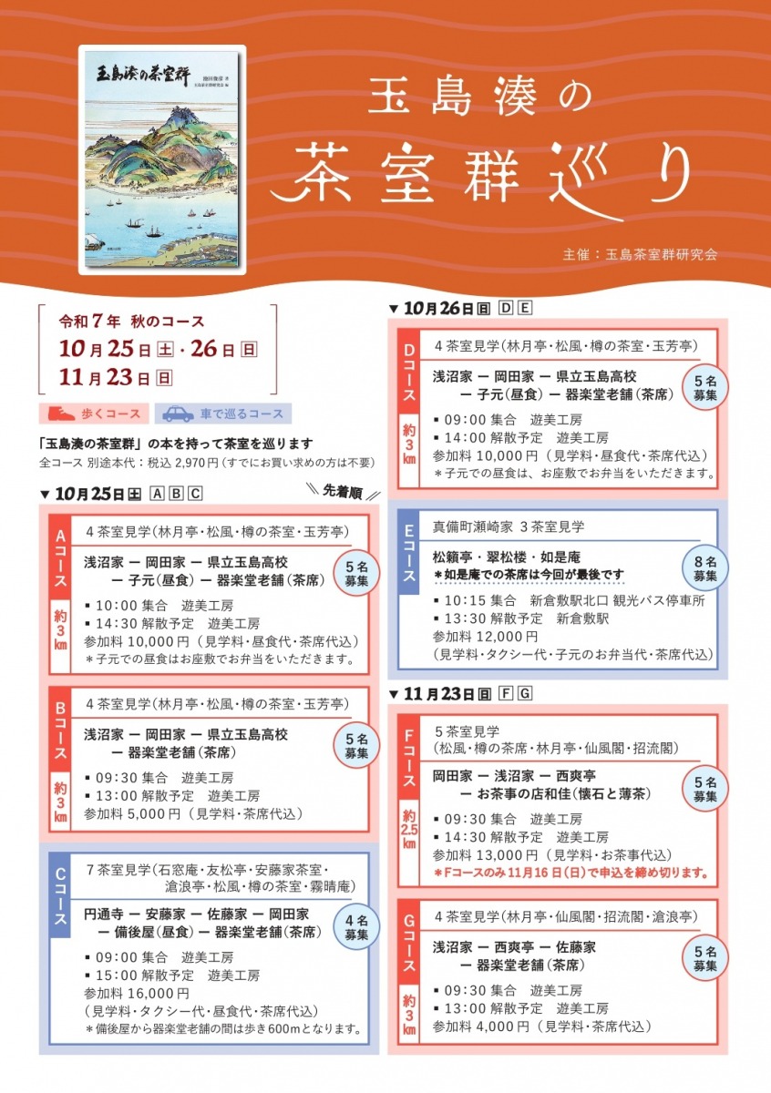 「玉島湊の茶室群」の本を持って茶室を巡るツアーが開催されます。色々なコースがあり、車で巡るコースもあります。昼食には備後屋の懐石、子元のお弁当、お茶事が用意されます。(コースによって異なる。)玉島の茶室はそれぞれ特徴があり、歩くコースでは昭和の面影が残る街並みを見ながら茶室を巡ることができます。
