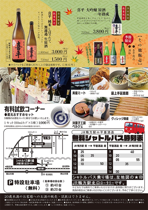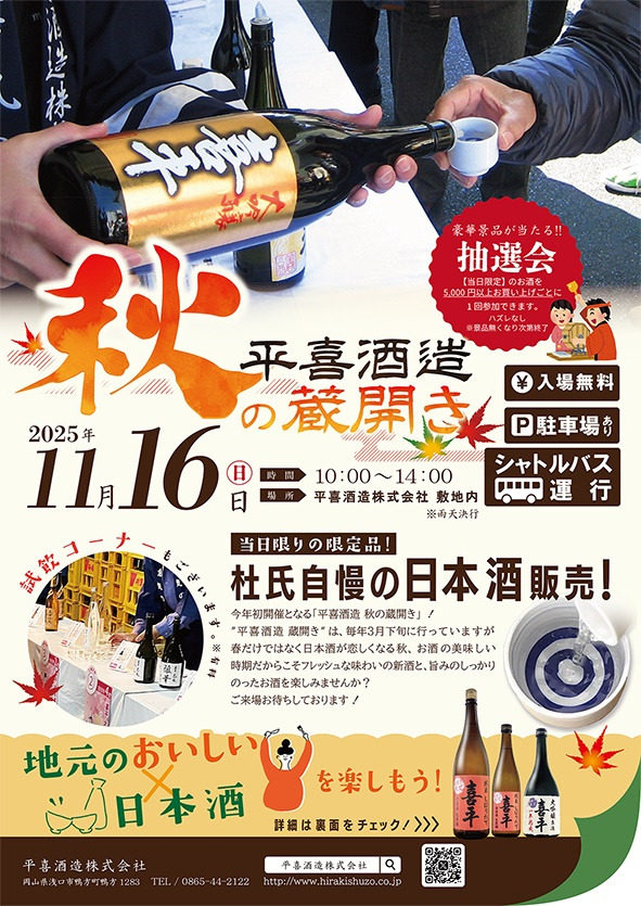 浅口市の「平喜酒造」にて、「秋の蔵開き」が開催されます。毎年3月下旬に蔵開きを開催されてますが、今回は初めて秋にも開催されます。春だけではなく日本酒が恋しくなる秋、お酒の美味しい時期だからこそフレッシュな味わいの新酒と旨みのしっかりのったお酒が楽しめます。グルメコーナーも設置されます。