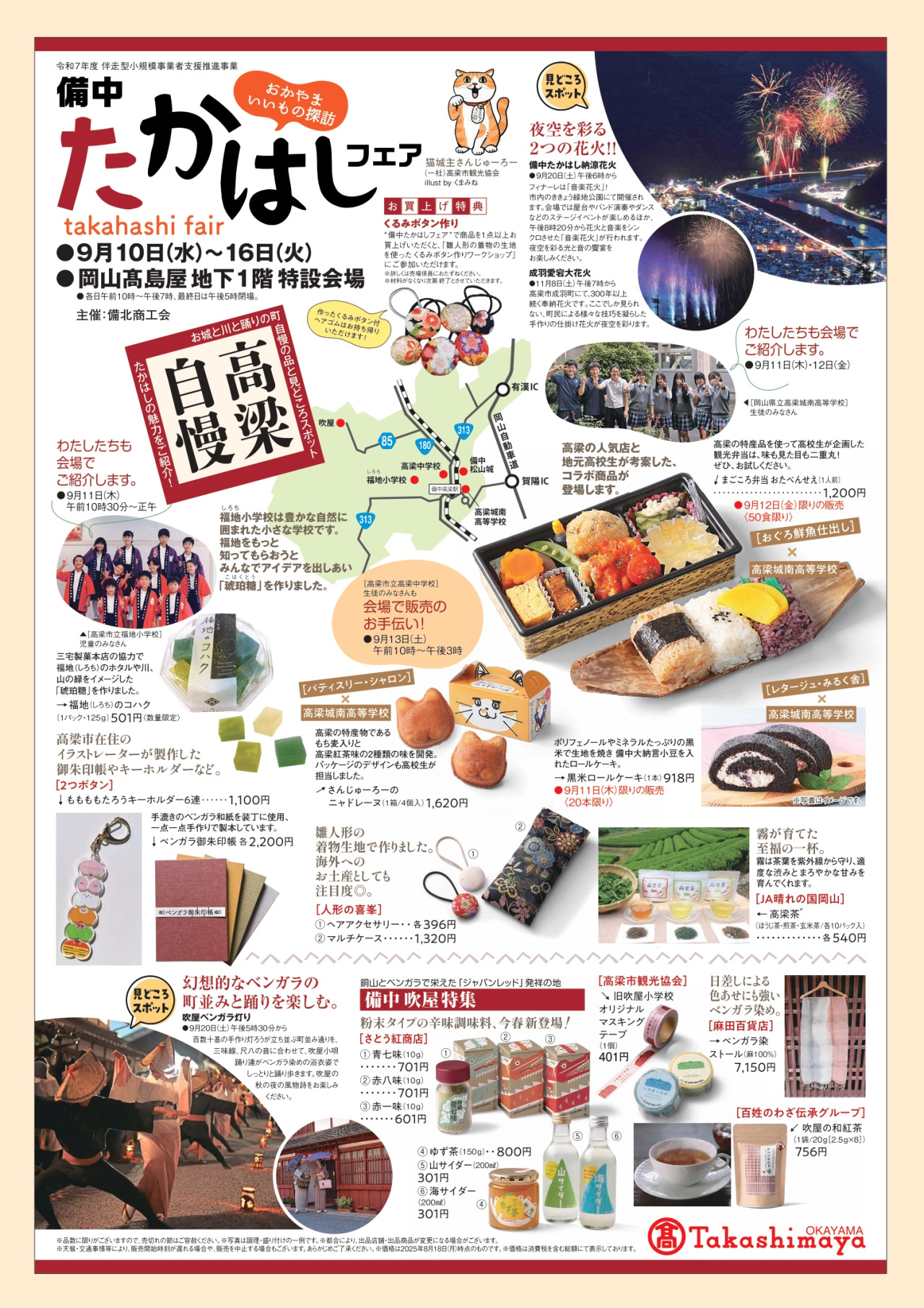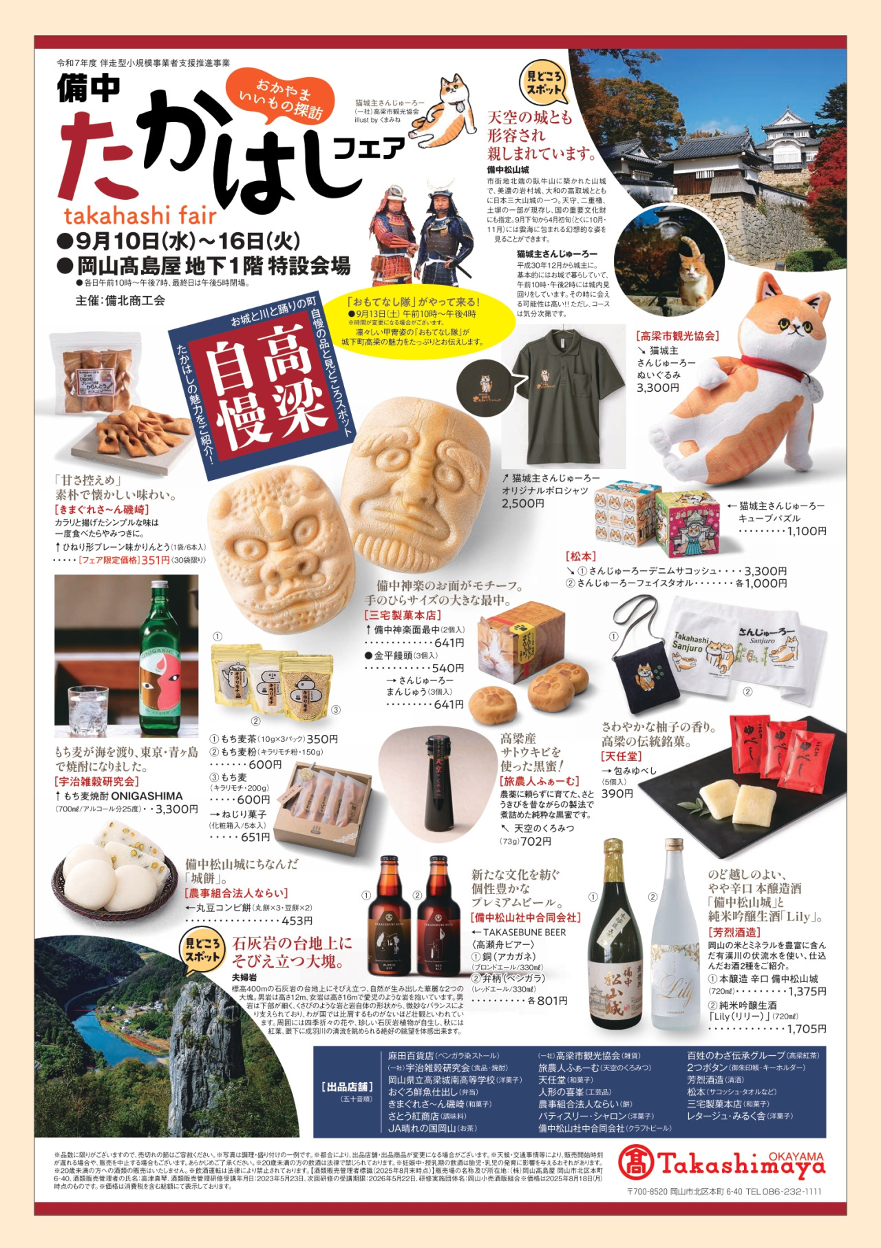 岡山髙島屋 地下1階 特設会場にて、おかやまいいもの探訪 「備中 たかはしフェア」が開催されます。