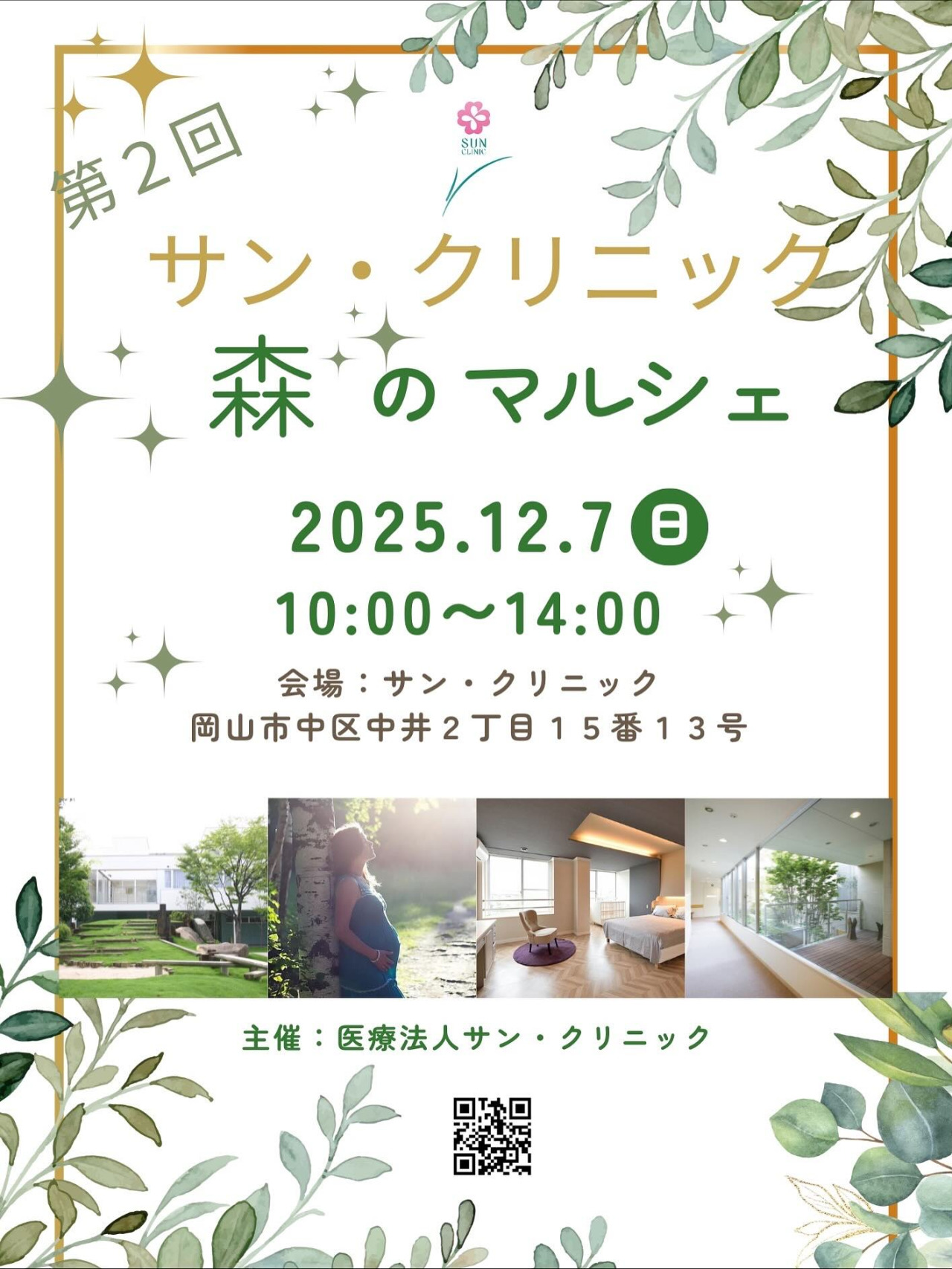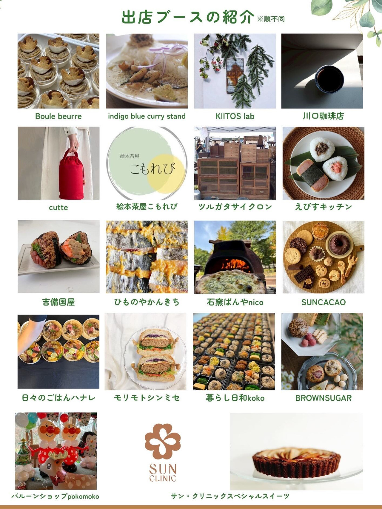 岡山市中区にある サン・クリニックにて「サン・クリニックもりのマルシェ」が開催されます。材料にこだわり、一つひとつ丁寧に作られた美味しいもの、お花、絵本、古道具など、17店舗が出店。クリニックのシェフ特製スイーツも並びます。