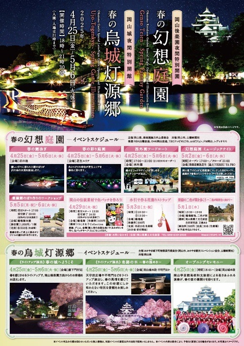 岡山城天守と烏城公園一帯を光で彩るライトアップイベント「春の烏城灯源郷」が、開催されます。漆黒の岡山城が鮮やかに照らし出され、昼間とは違う幻想的なシルエットが浮かびあがる圧巻の見応えが堪能できます。期間中は、天守の夜間営業が行われるほか、対岸の岡山後楽園でも同期間に「春の幻想庭園」を開催されます。