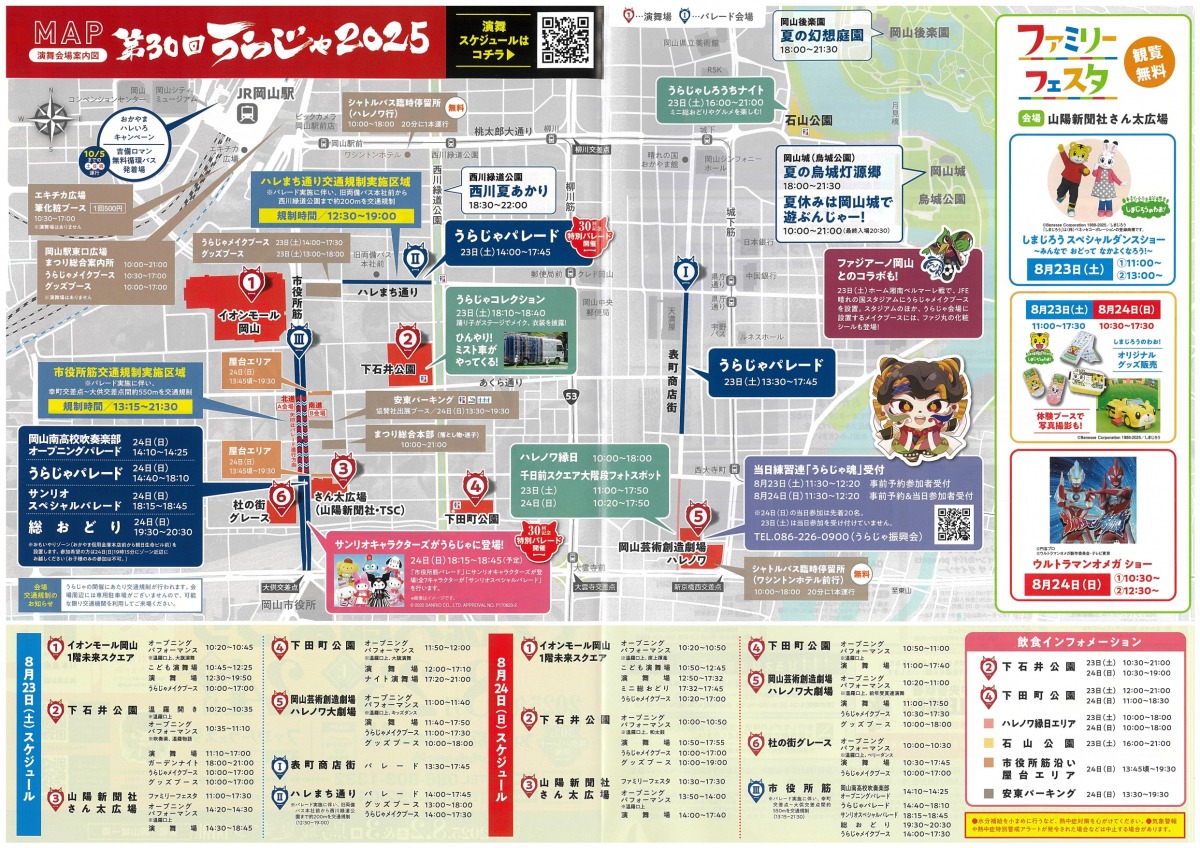- 下石井公園、イオンモール岡山(1階 未来スクエア)、さん太広場(山陽新聞社新本社ビル 1階広場)、中央町下田町公園、岡山芸術創造劇場ハレノワ、杜の街グレース、表町商店街、ハレまち通り、市役所筋