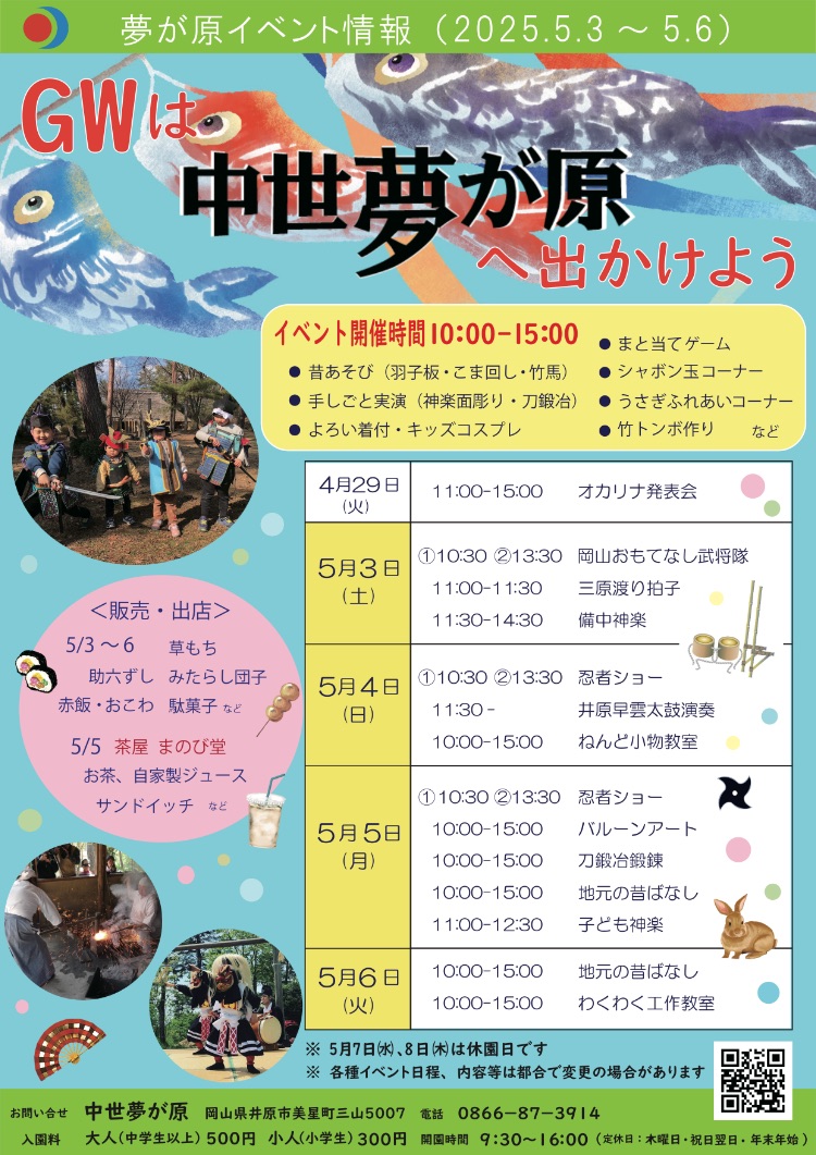 5月5日(月)…忍者ショー(①10:30~、②13:30~)、地元昔ばなし(10:00~15:00)、子ども神楽(11:00~12:30)、バルーンアート(10:00~15:00)、刀鍛冶鍛錬(10:00~15:00)