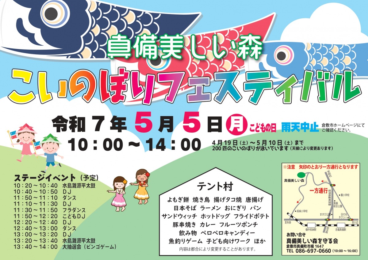 真備美しい森にて子どもの日に「こいのぼりフェスティバル」が開催されます。