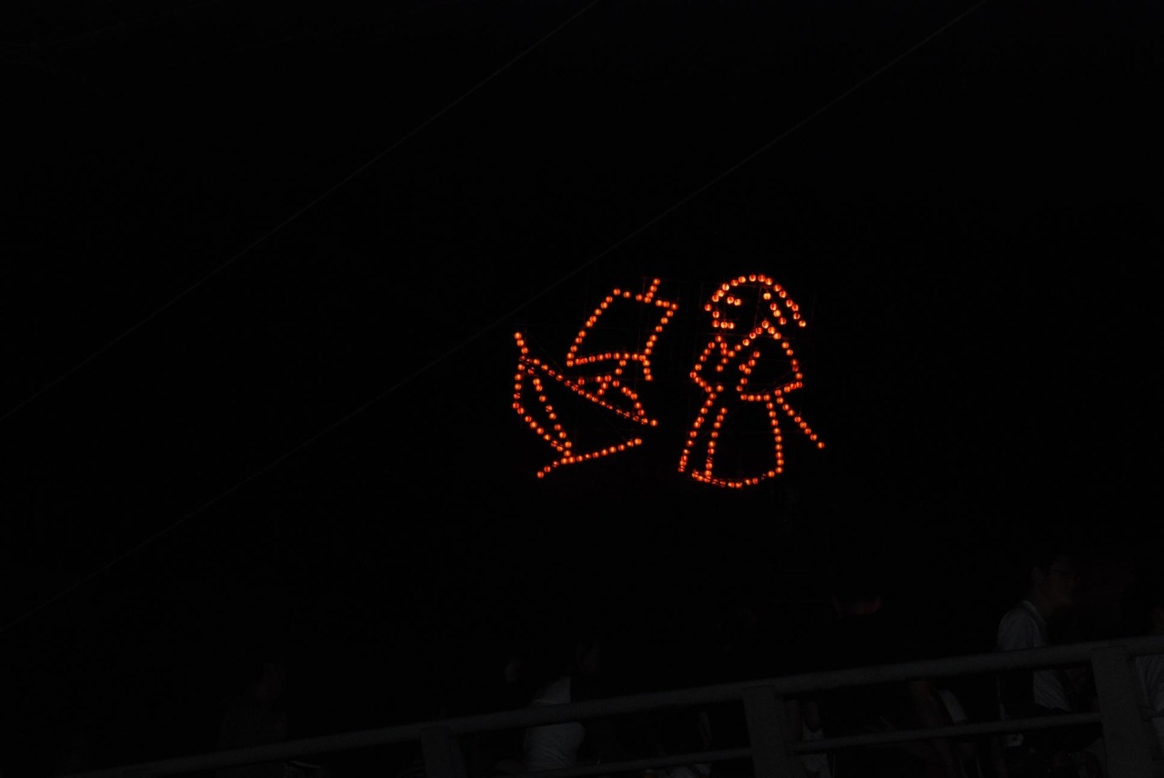 「火を高く(掲げる)」ことから由来するとされており、吉田川を挟んで向かい合う行者山と妙見山をそれぞれ源氏と平家に見立て提灯で絵模様を描き、その優劣を競うものです。絵模様はその年の世相を映したもので、毎年宵闇に浮かび上がるまでは秘密とされています。