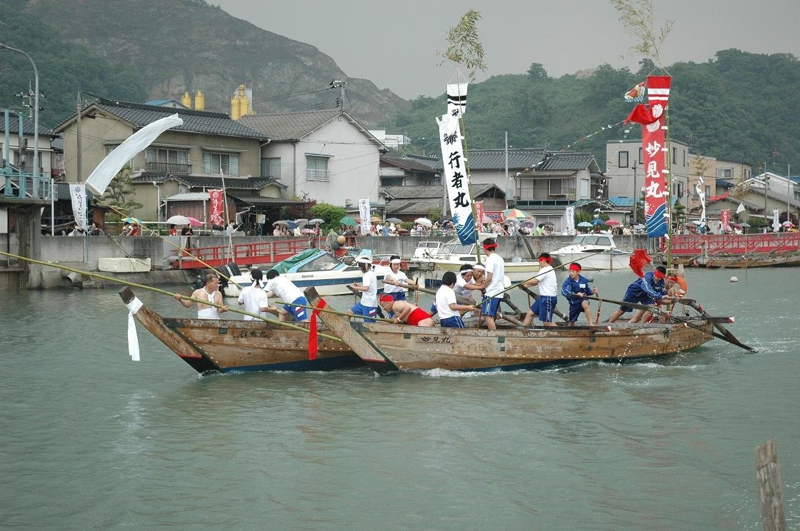 源平の舟いくさが発端で「船漕ぎの競争」とも言われ、語源は「漕ぎくらべ」がなまったものといわれています。二隻の和船に6人ずつこぎ手が乗り、源氏方と平家方に分かれて海水をかけあいながら競争します。笠岡市の伝統行事「ひったか」の翌日に開催されます。
