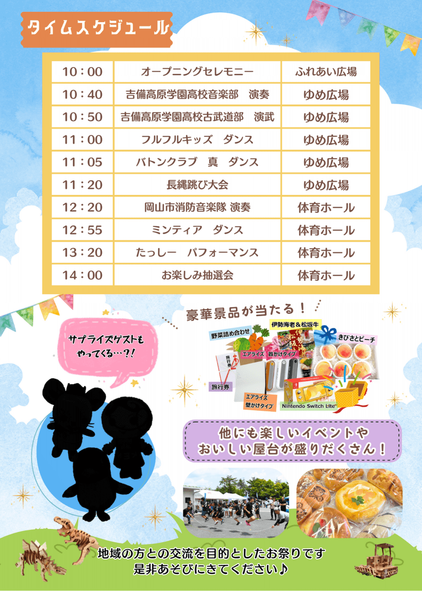 吉備の里にて「ふるさとまつり」が開催されます。おいしい屋台グルメや餅つき大会、長縄跳び大会、ステージパフォーマンス、抽選会などイベントが盛りだくさんです。保護犬&保護猫の譲渡会も同時開催されます。