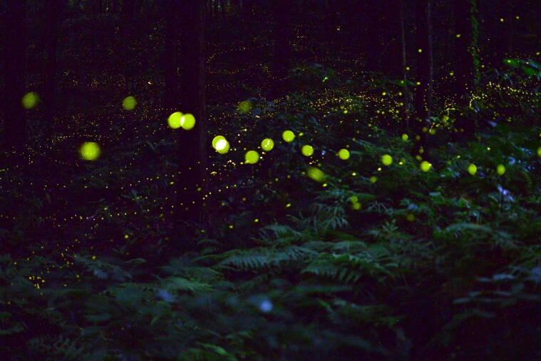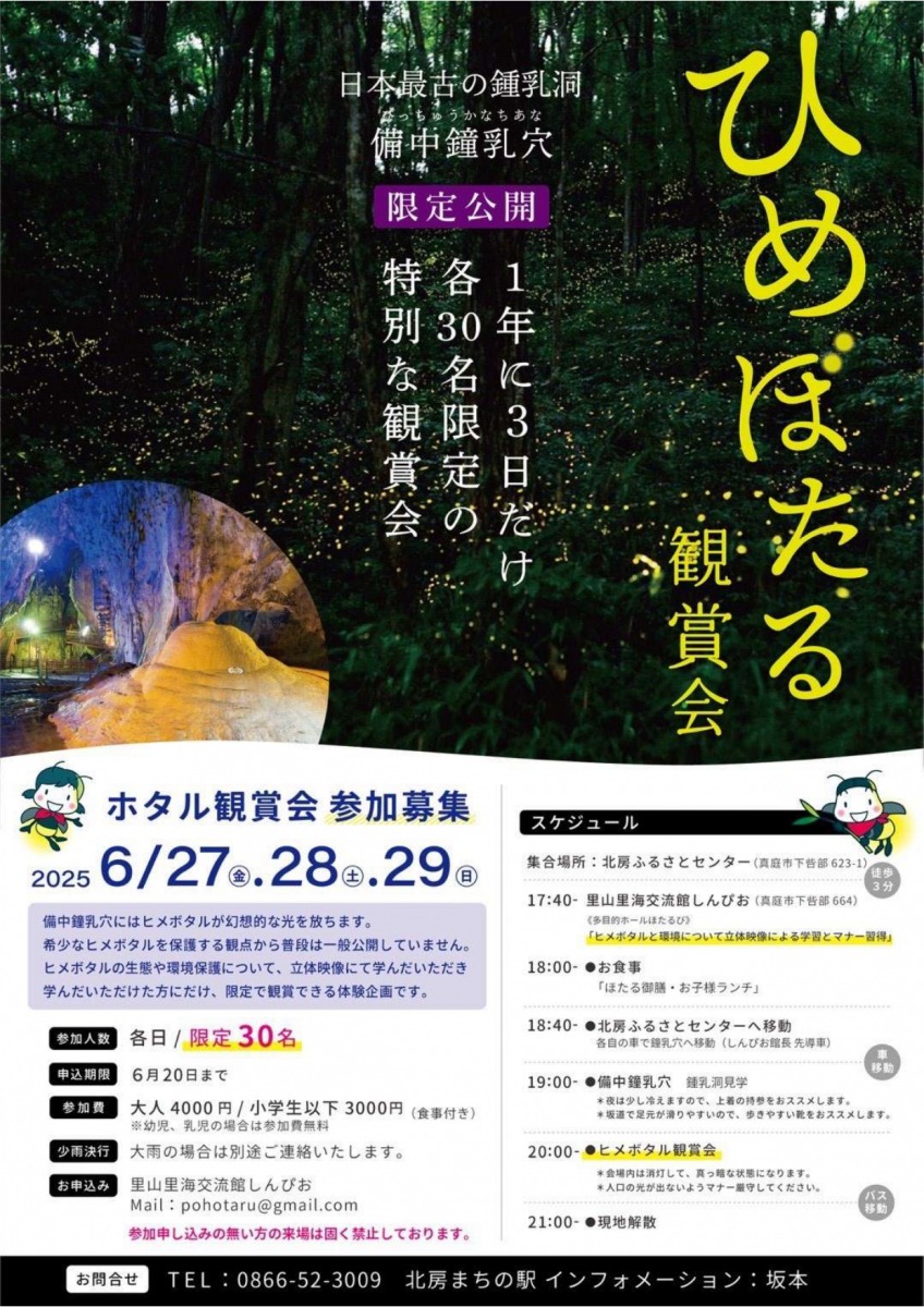 備中鐘乳穴の敷地内には6月末から、沢山のヒメボタルが幻想的な光を放ちます。希少なヒメボタルを保護する観点から、普段は一般公開されていません。