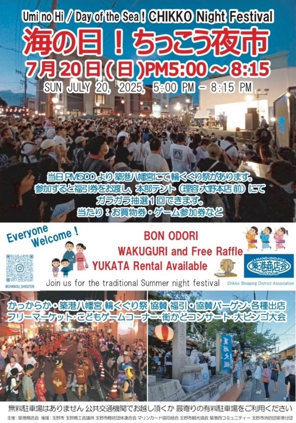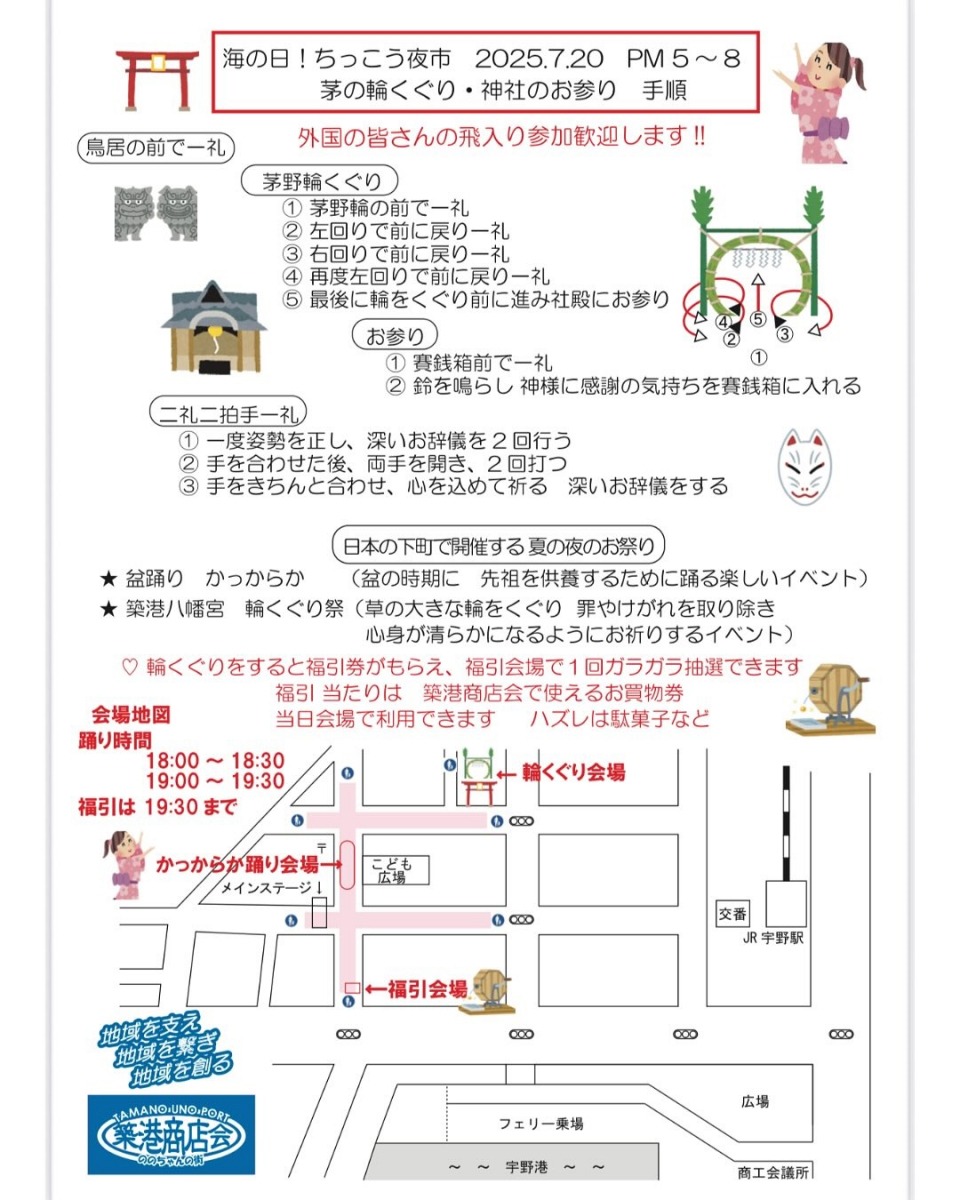 築港商店街で毎年開催されるお祭りです。玉野市の無形文化財にも認定されている伝統的な踊り「かっからか」で、踊り子が練り歩きます。築港八幡宮の輪くぐり祭も同日開催。子どもゲームコーナー、フリーマーケット、ステージイベント、屋台、ビンゴ大会など、イベントが盛りだくさんです。