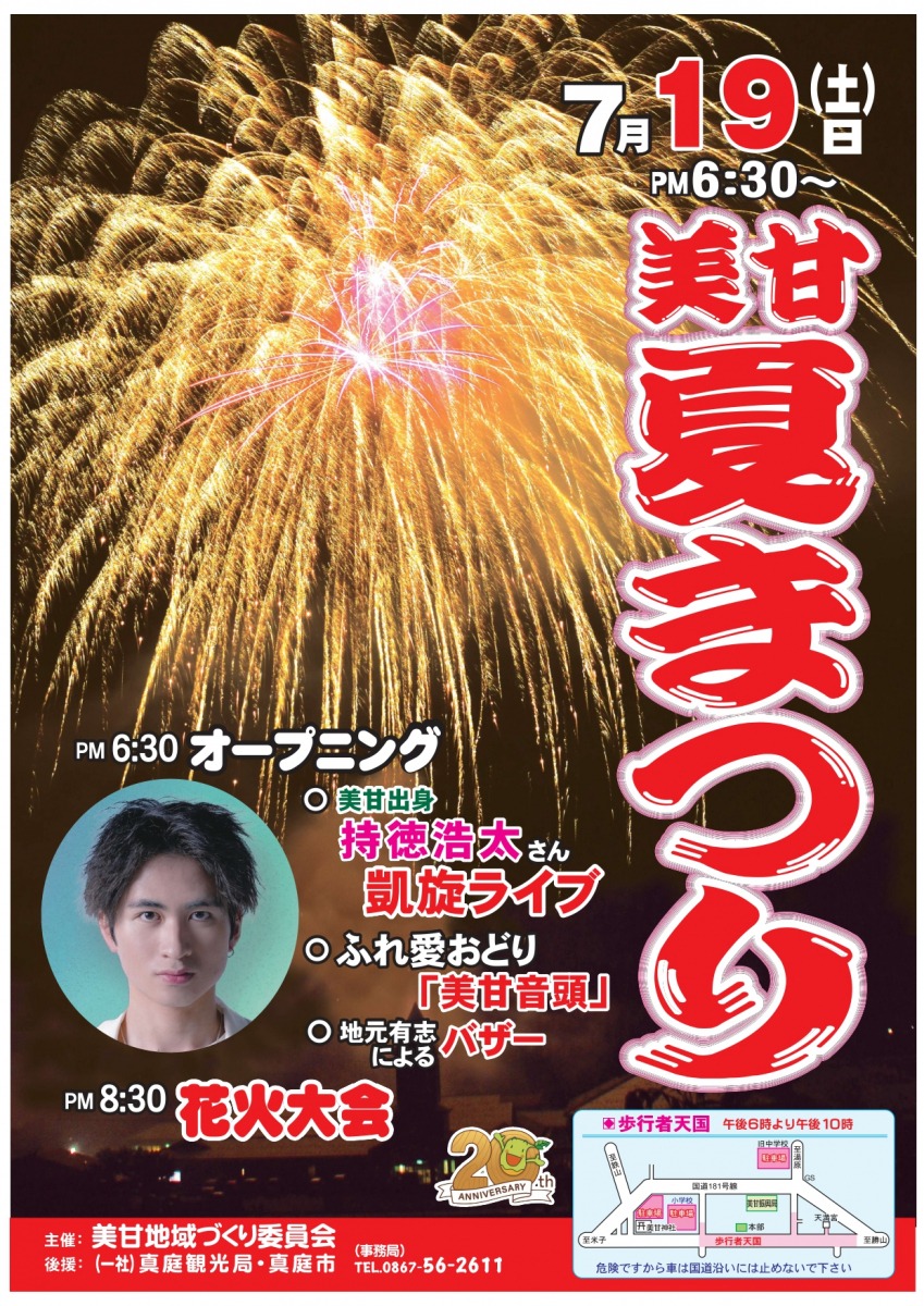 150年の歴史を誇る天神祭にあわせて開催されます。旧宿場町の通りが歩行者天国になり、「美甘音頭」、ライブ、地元有志によるバザーで賑わいます。20:30からは打ち上げ花火も行われます。その音は周囲の山々に反響して迫力があると評判です。
