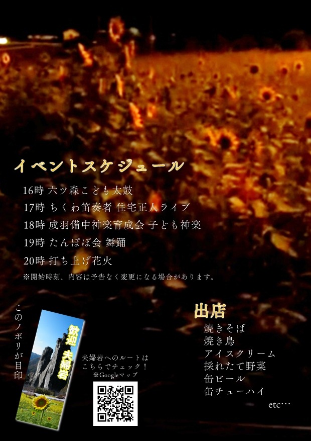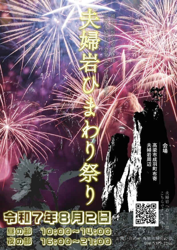 高梁市成羽地区の標高400mにそびえる夫婦岩(めおといわ)付近で、ひまわりの開花時期にあわせて開催されるイベントです。16:00からはビアガーデン、20:00頃からは花火も行われます。出店をはじめ様々なイベントが予定されています。