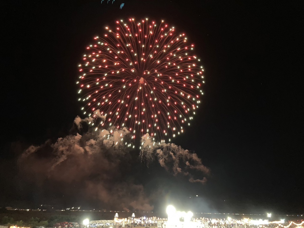 地元団体の出し物やうちわ抽選会、沢山の屋台があり子どもからお年寄りまで大勢の人で賑わう夏のまつり。総勢約1,200名が参加する「総おどり」やパフォーマンスを競う「ええとこ離し踊りコンテスト」が繰り広げられ、会場は熱気に包まれます。フィナーレは約2,500発の花火が打ち上げられます(20:45~21:00)。