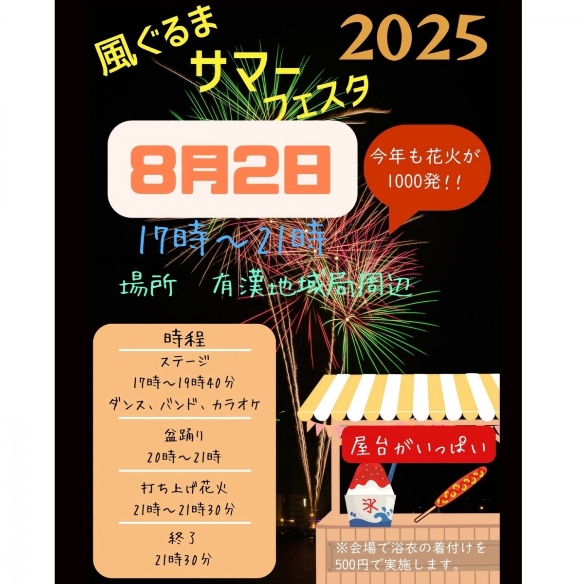 「有漢町納涼ふるさと祭」が少しだけリニューアルされた「風ぐるまサマーフェスタ」が開催されます。ステージイベントやキッチンカーなど、イベントが盛りだくさんです。会場では浴衣の着付けが500円で実施されます。