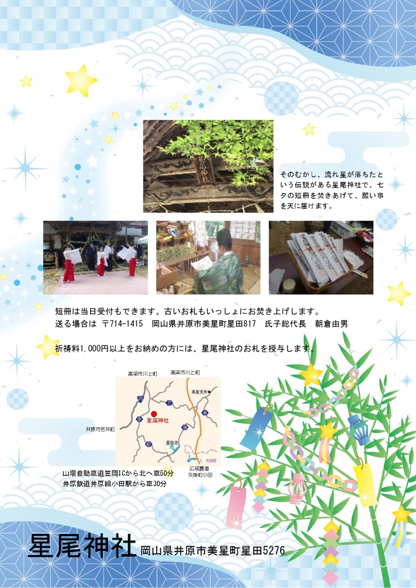 - ※短冊受付先:〒714-1415 井原市美星町星田817 朝倉 由男 様宛(0866-87-2636)