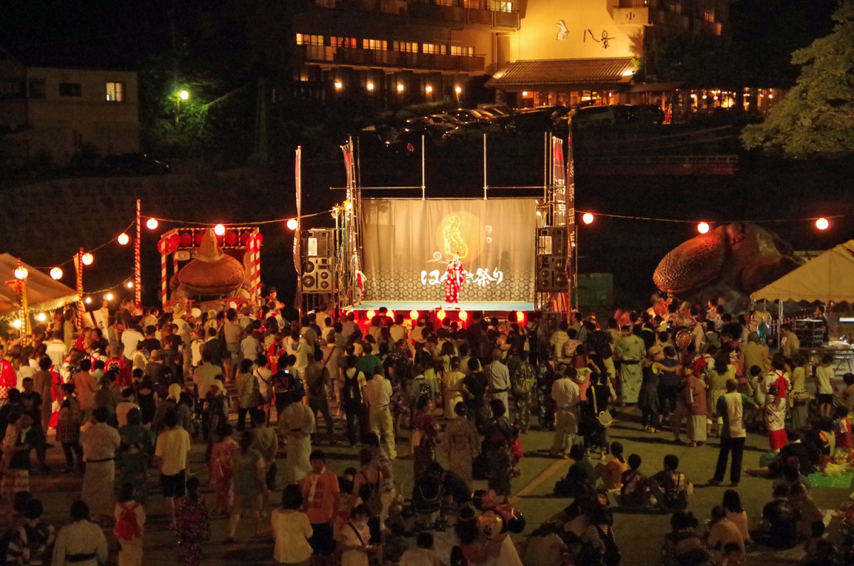 1万年前から変わらぬ姿のオオサンショウウオ(はんざき)に出会える湯原温泉。温泉街では毎年夏まつりが行われ、大はんざきの山車や道中ばやし、はんざきねぶたも登場し、湯原温泉がはんざき一色に染まります。