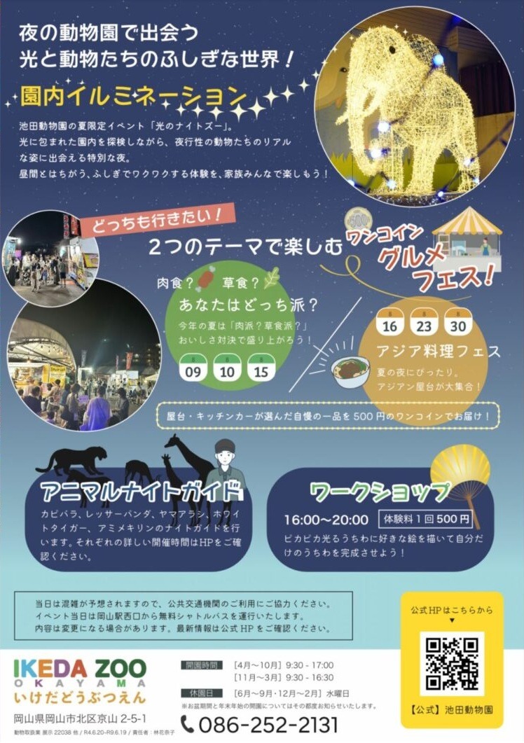 夜の動物の様子を観察できるアニマルナイトガイドやオリジナルの光るうちわをつくるワークショップなども開催。キッチンカーで美味しいご飯やお酒も楽しめます。