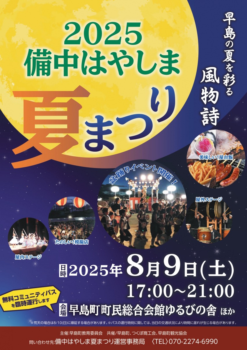 - 070-2274-6990(備中はやしま夏まつり運営事務局)