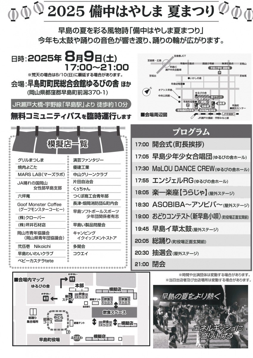 早島の夏をより熱く、エネルギッシュに盛り上げる一大イベントです。各種団体によるステージ、伝統の盆踊りや地元団体・企業による模擬店の実施を予定しています。