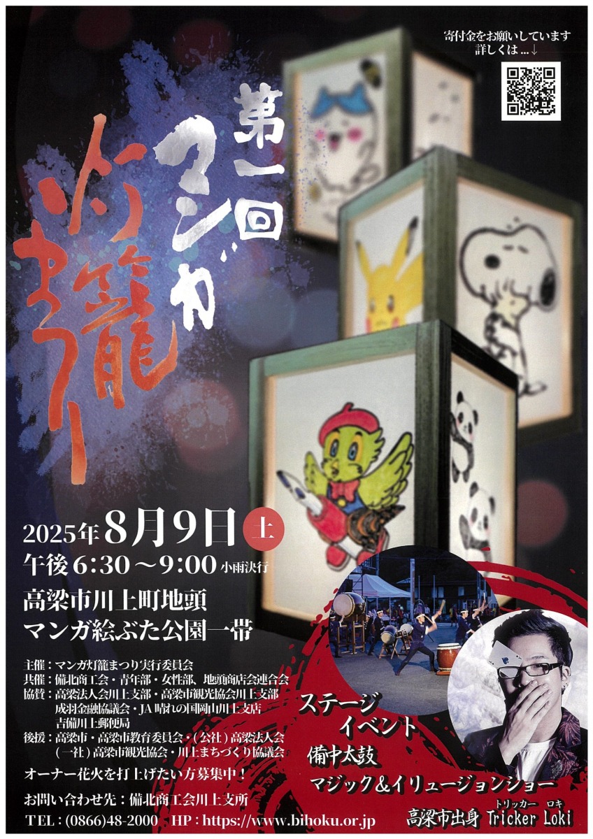 「マンガ灯籠まつり」は旧川上町時代から取り組んでいた「マンガのまちづくり」の趣旨で実施していた「マンガ絵ぶたまつり」を継承するお祭りです。市内の小中学校や高等学校の児童・生徒等が描いたマンガ灯籠約300個と、実行委員会と住民有志で制作した大型壁面灯籠が夕暮れ時に明かりを灯し、マンガ絵ぶた公園一帯を幻想的に彩られます。