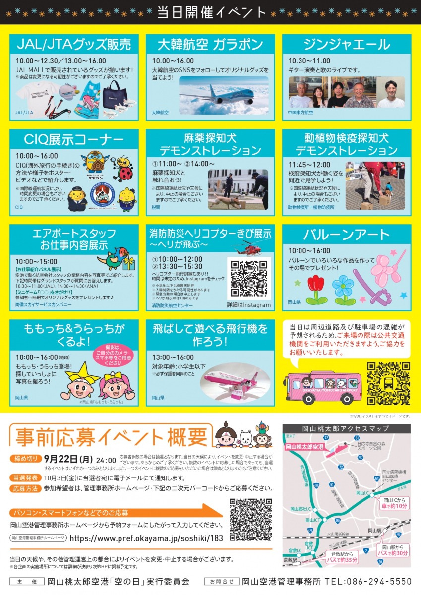 航空に対する理解と関心を高める「空の旬間(9月20日~30日)」の関連行事として、岡山桃太郎空港で「空の日フェスタ」が開催されます。空港や飛行機を身近に感じられる企画が盛りだくさん。